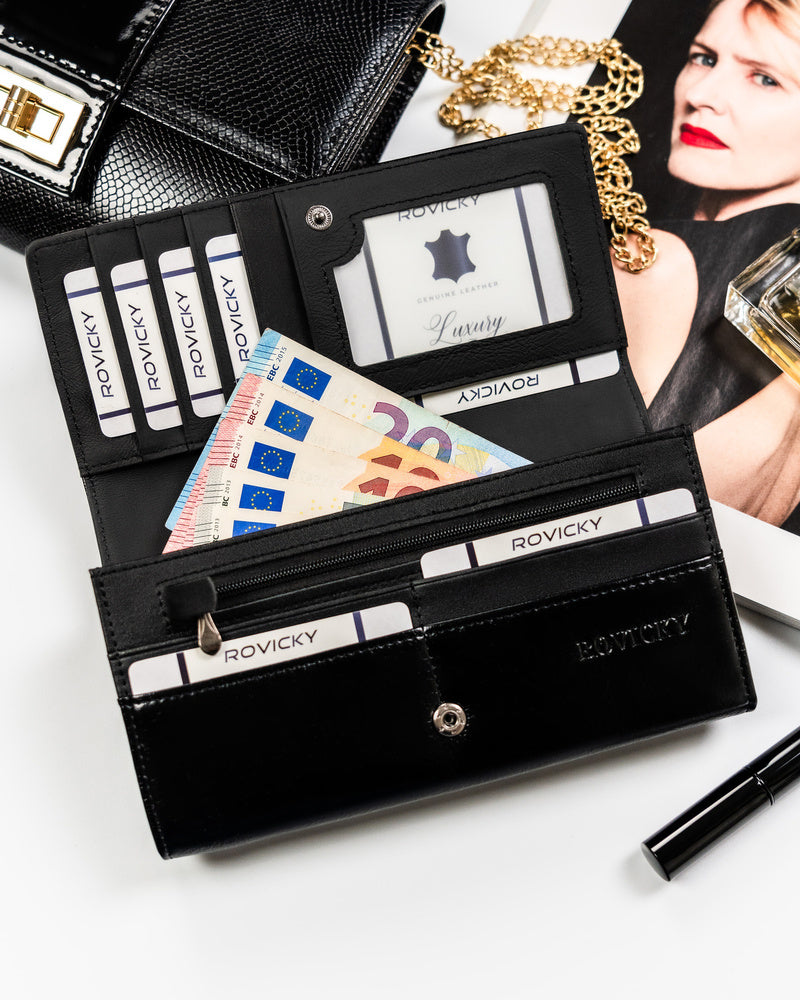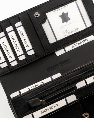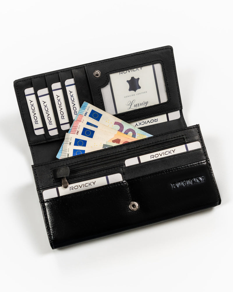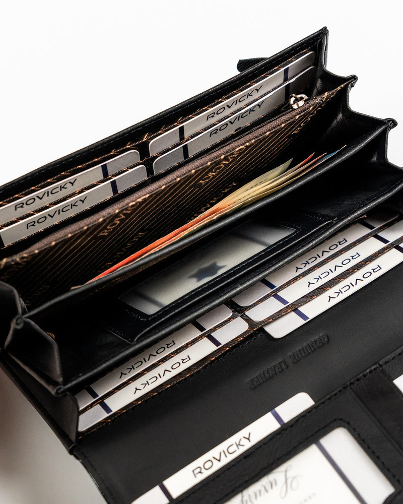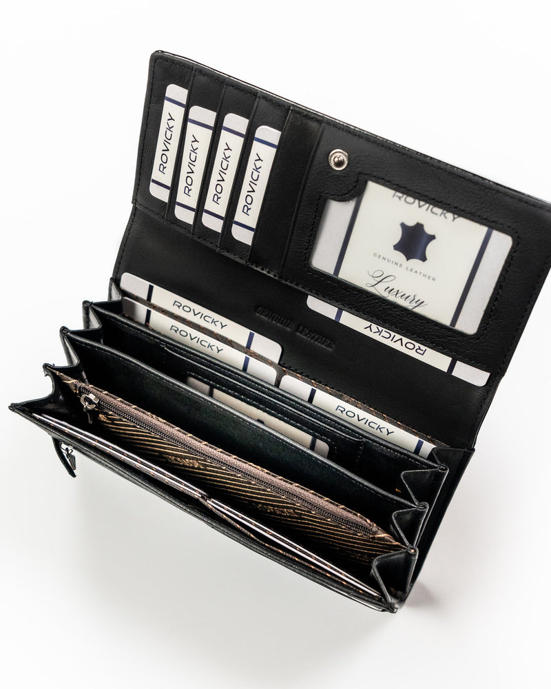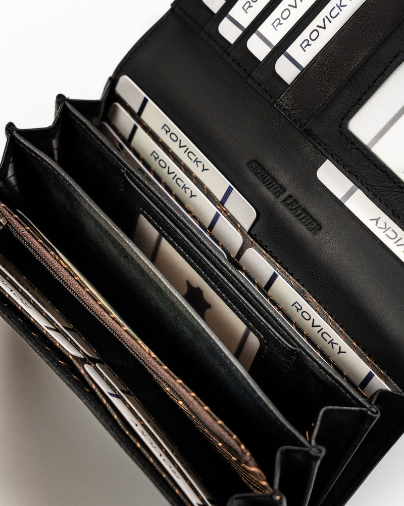 Šis elegantais un ietilpīgais maks ir lieliska izvēle sievietēm, kuras novērtē kvalitāti un funkcionalitāti. Izgatavots no īstas ādas, tas nodrošina izturību un stilīgu izskatu. Melnā krāsa nodrošina daudzpusību, tāpēc maks lieliski piestāvēs dažādiem apģērba stiliem. Lai gan tam nav RFID aizsardzības, tas piedāvā vairāk nekā 15 karšu nodalījumus, ļaujot ērti uzglabāt visas nepieciešamās kartes. Pateicoties lielajam izmēram un praktiskajiem izmēriem, šis maks ir ērts ikdienas lietošanai.