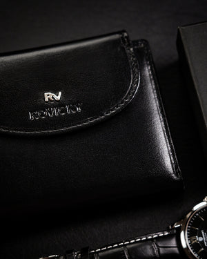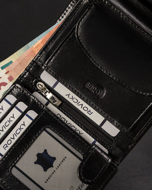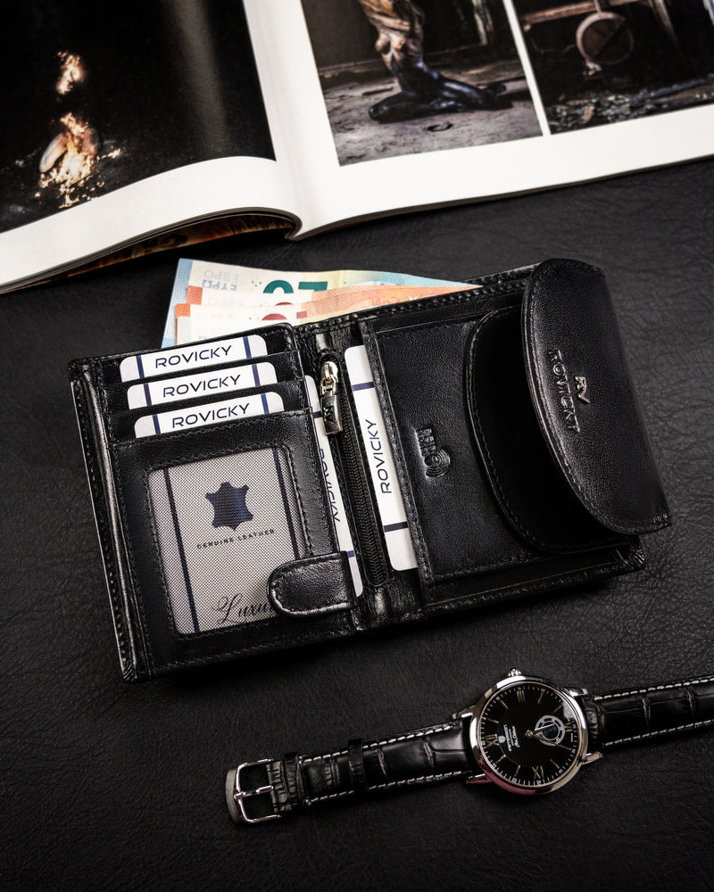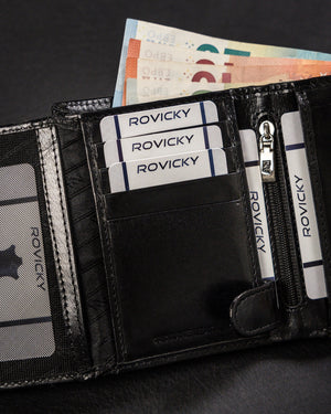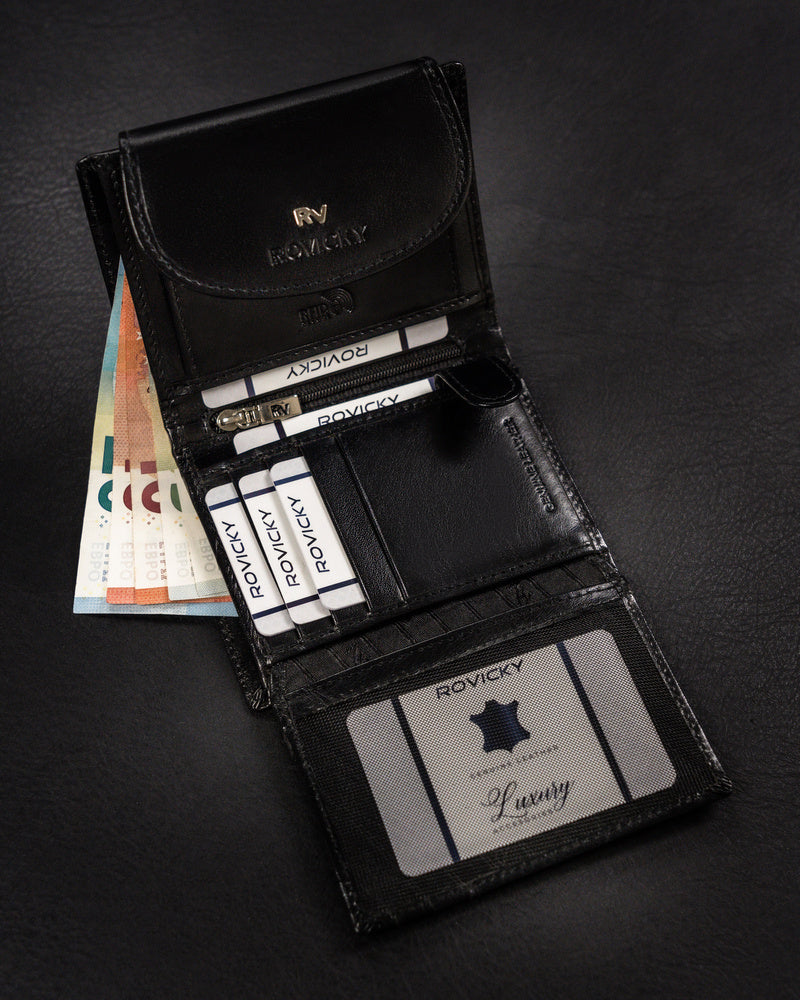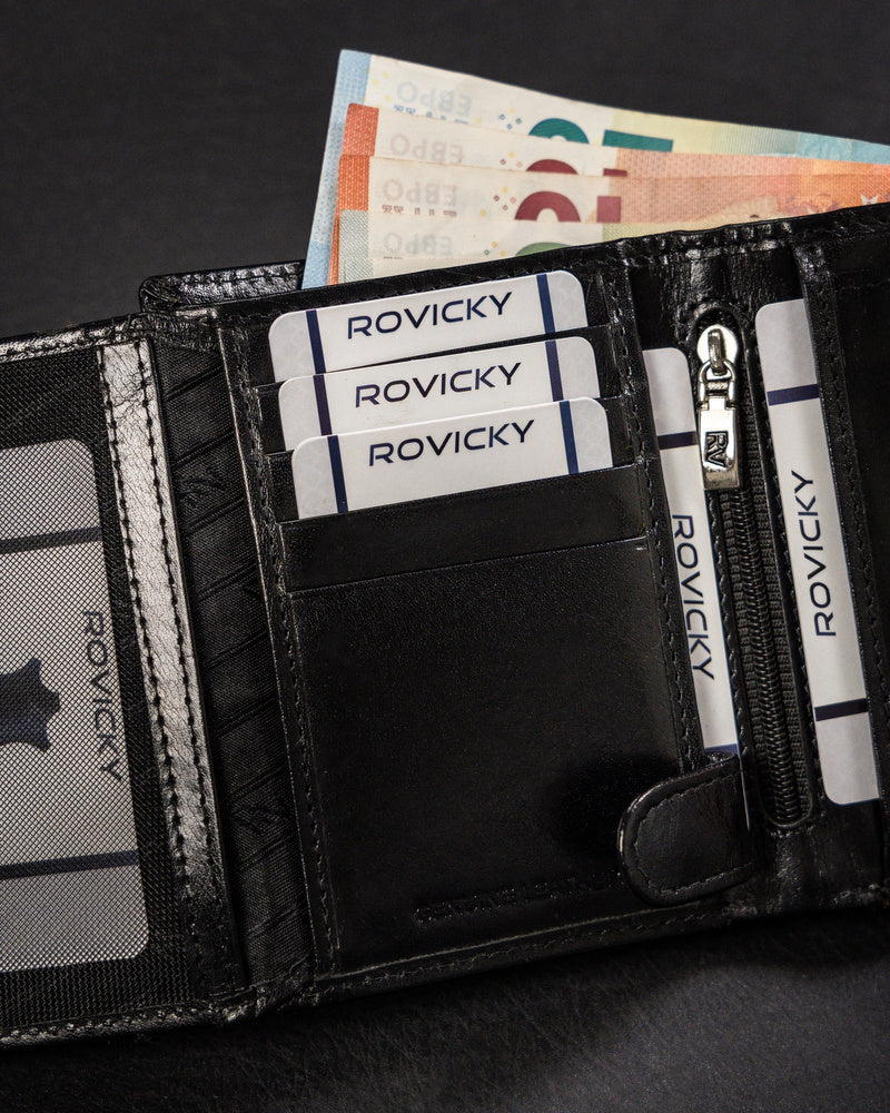 Šis elegantais un funkcionālais sieviešu maks no Rovicky ir izgatavots no augstas kvalitātes īstas ādas. Melnā krāsa nodrošina klasisku un daudzpusīgu stilu, kas piemērots dažādiem gadījumiem. Vidēja izmēra maks ir ērts ikdienas lietošanai, un RFID aizsardzība nodrošina jūsu karšu drošību. Ar 6-10 karšu nodalījumiem tas ir lieliski piemērots gan ikdienas vajadzībām, gan īpašiem gadījumiem.