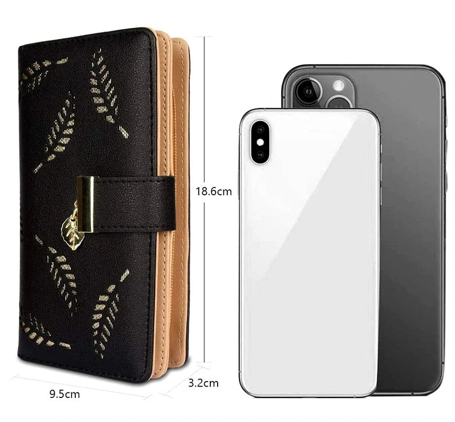 Šis elegantais melnzelta sieviešu maks ir perfekta stila un funkcionalitātes kombinācija. Izgatavots no organiskās ādas ar smalkiem izgriezumiem, kas atklāj izsmalcinātas zelta krāsas lapas, šis maks ne tikai izskatās grezns, bet arī ir ārkārtīgi praktisks.