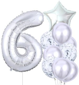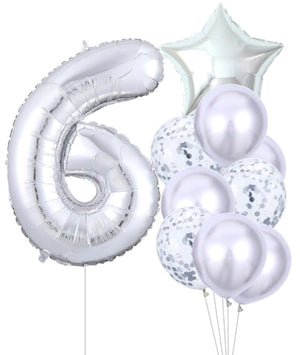 Komplektā ietilpst 10 dažādu izmēru un formu baloni. Komplektā ietilpst uzmanību piesaistošs liels folijas balons ar numuru seši, zvaigznes formas izstrādājums un astoņi klasiski lateksa baloni. Daži izstrādājumi ir caurspīdīgi un pildīti ar smalku sudraba konfeti.