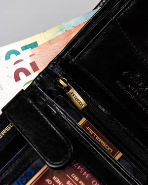 Šis elegantais Peterson zīmola maks ir izgatavots no augstas kvalitātes īstas ādas, kas nodrošina izturību un stilīgu izskatu. Melnais dizains piešķir klasisku un daudzpusīgu izskatu, kas piemērots jebkuram gadījumam.