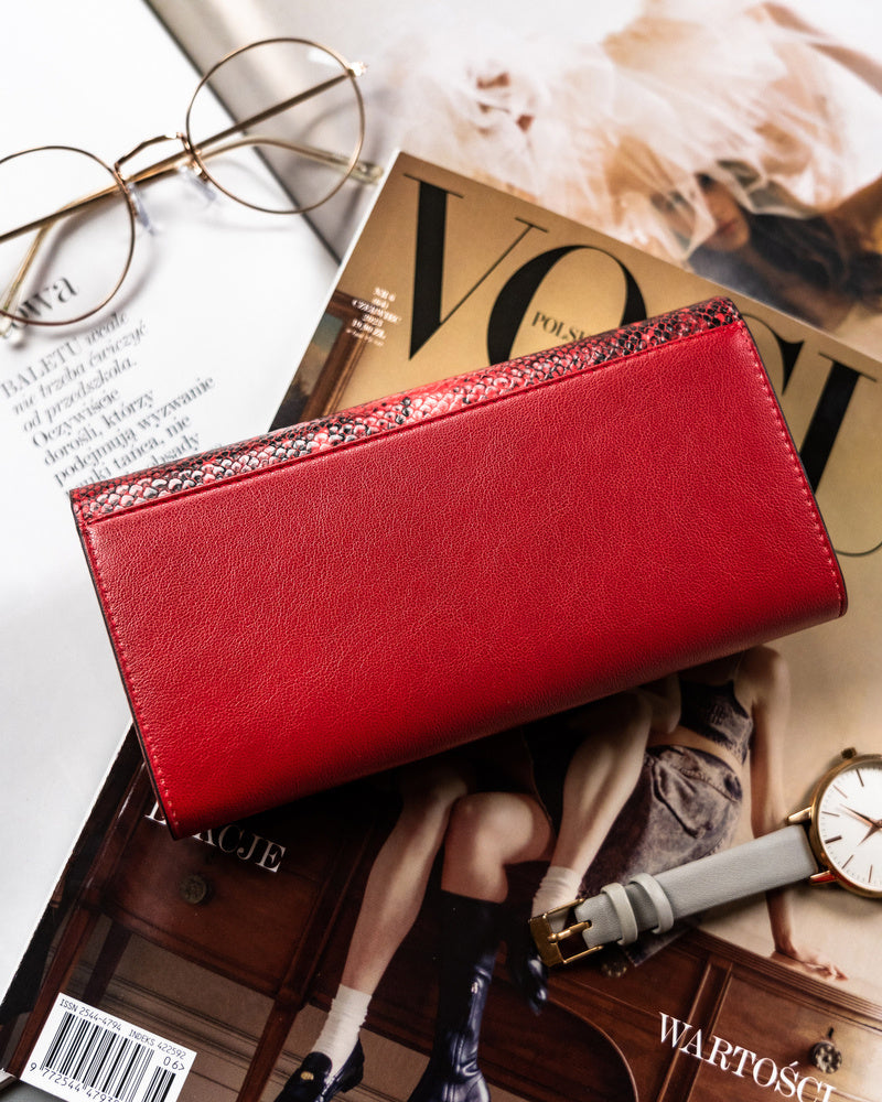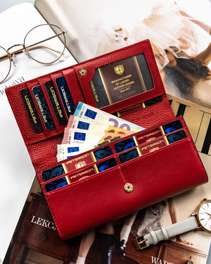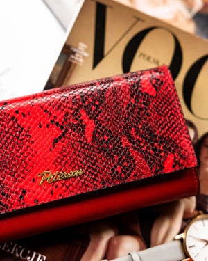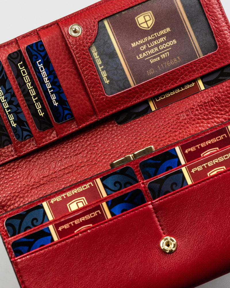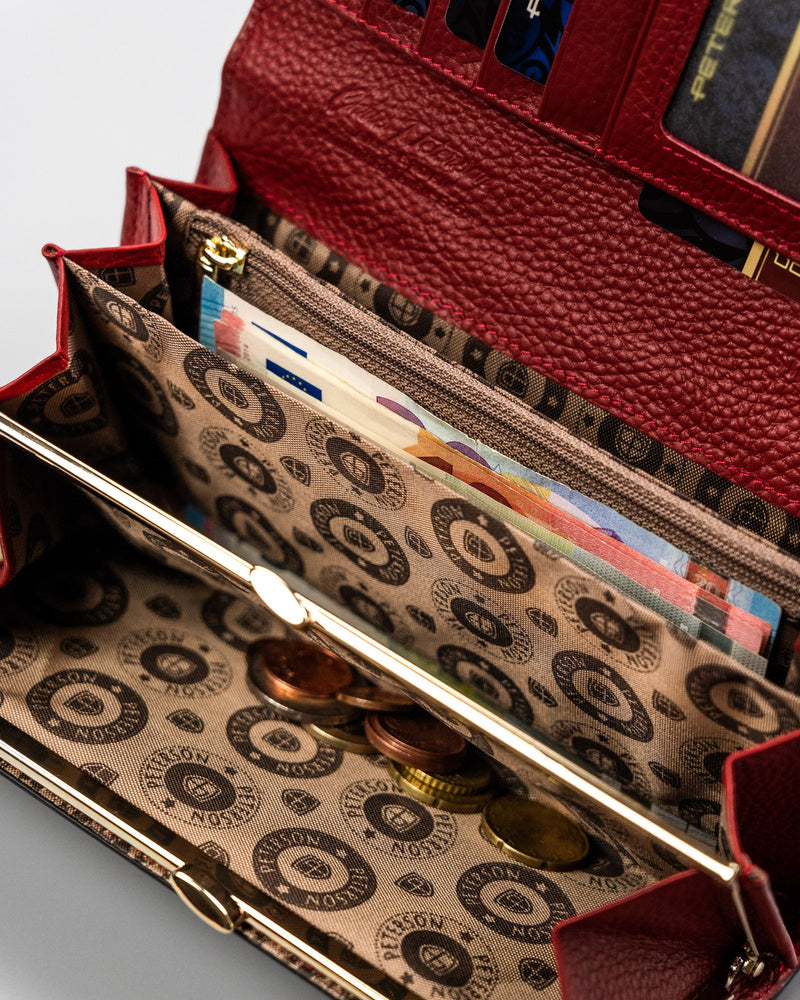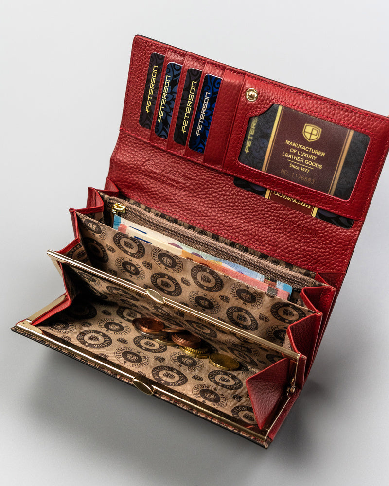 Šis elegantais sieviešu maks no Peterson kolekcijas ir izgatavots no augstas kvalitātes īstas ādas. Sarkanā krāsa piešķir tam izsmalcinātību un stilu, un lielais izmērs nodrošina pietiekami daudz vietas visām jūsu mantām. Ar 6-10 karšu nodalījumiem un atsevišķu nodalījumu monētām šis maks ir praktisks un ērts ikdienas lietošanai.