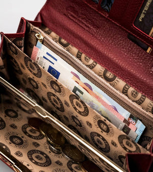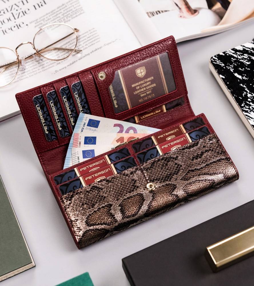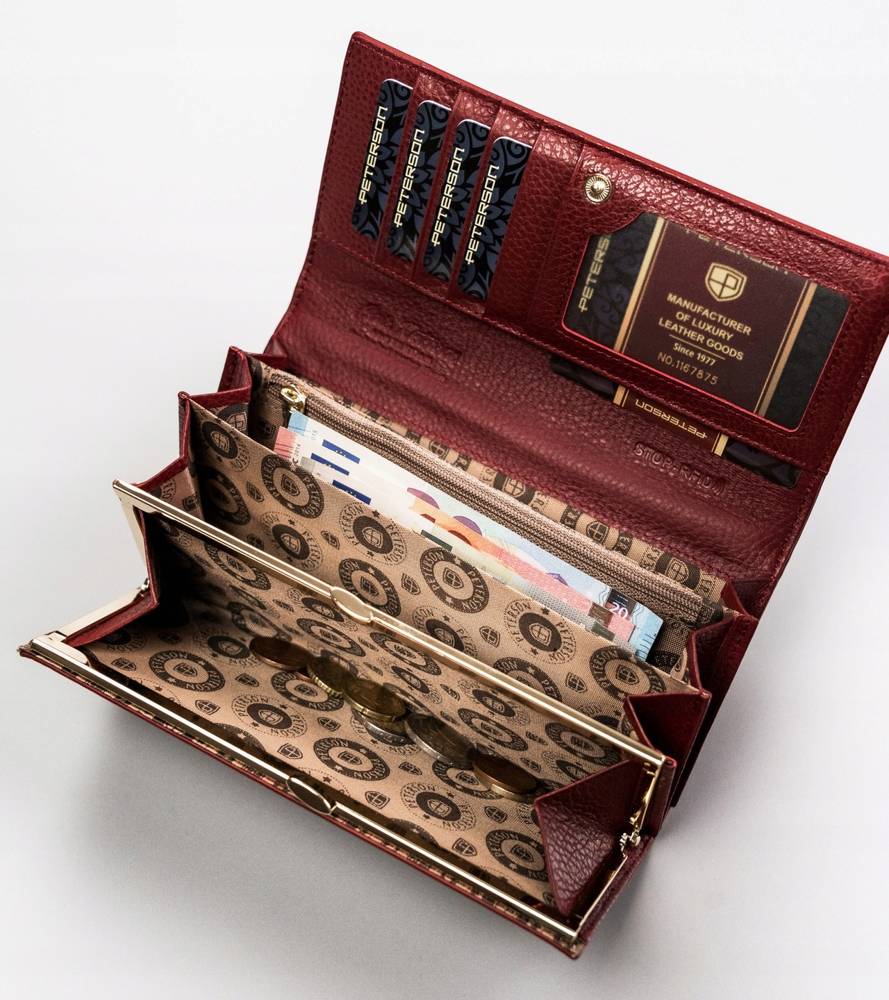 Šis elegantais sieviešu maks no Peterson kolekcijas ir izgatavots no augstas kvalitātes īstas ādas. Spilgti sarkanā krāsa piešķir stilu un ekskluzivitāti. Lielais izmērs nodrošina, ka jums būs pietiekami daudz vietas visām jūsu svarīgākajām lietām. Makam ir 6-10 karšu nodalījumi un atsevišķs nodalījums monētām, padarot to ārkārtīgi praktisku ikdienas lietošanai.