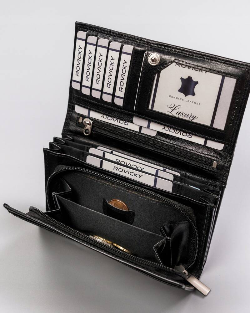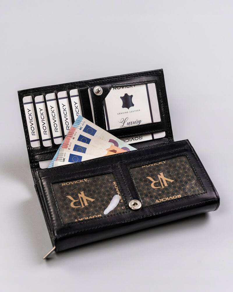 Šis elegantais un funkcionālais sieviešu maks no Rovicky ir izgatavots no augstas kvalitātes īstas ādas. Melnā krāsa nodrošina klasisku un daudzpusīgu stilu, kas piemērots jebkuram gadījumam. Lielais izmērs nodrošina, ka jums būs pietiekami daudz vietas visām jūsu kartēm un skaidrai naudai. Turklāt maks ir aprīkots ar RFID aizsardzību, kas palīdz aizsargāt jūsu personas datus no neatļautas skenēšanas. Ar vairāk nekā 10 karšu nodalījumiem šis maks ir lieliska izvēle tiem, kas novērtē praktiskumu un drošību.