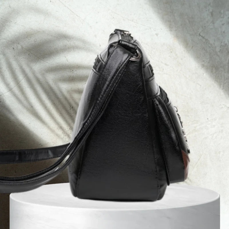 Šī melnā rokassoma ir ne tikai funkcionāla, bet arī stilīga, padarot to ideāli piemērotu gan ikdienas lietošanai, gan īpašiem gadījumiem.