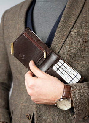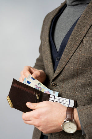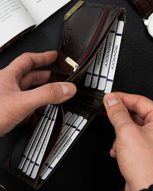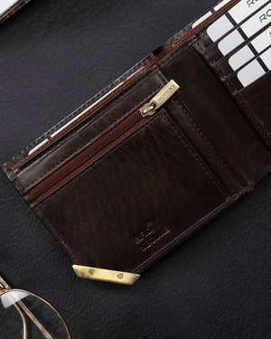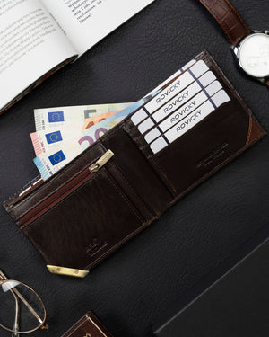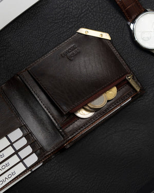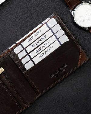 Šis Rovicky vīriešu maks ir izgatavots no augstas kvalitātes īstas ādas, kas nodrošina izturību un eleganci. Brūnais dizains piešķir tam klasisku un stilīgu izskatu.