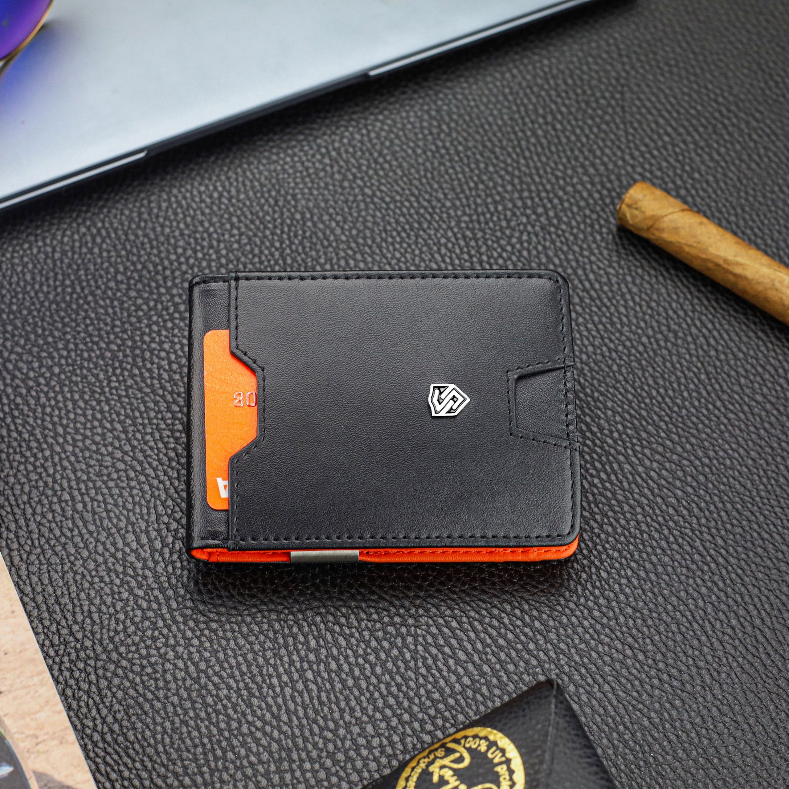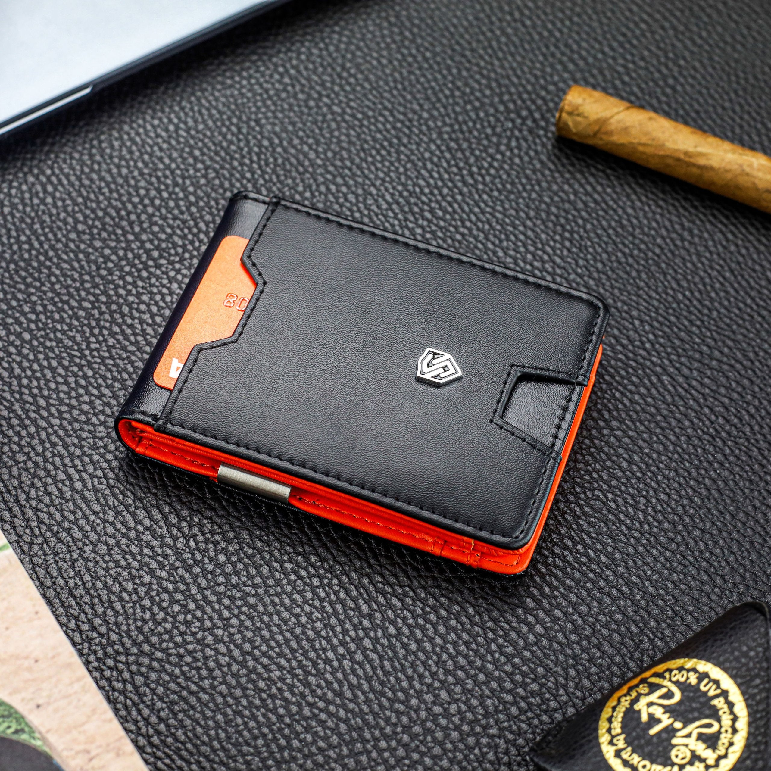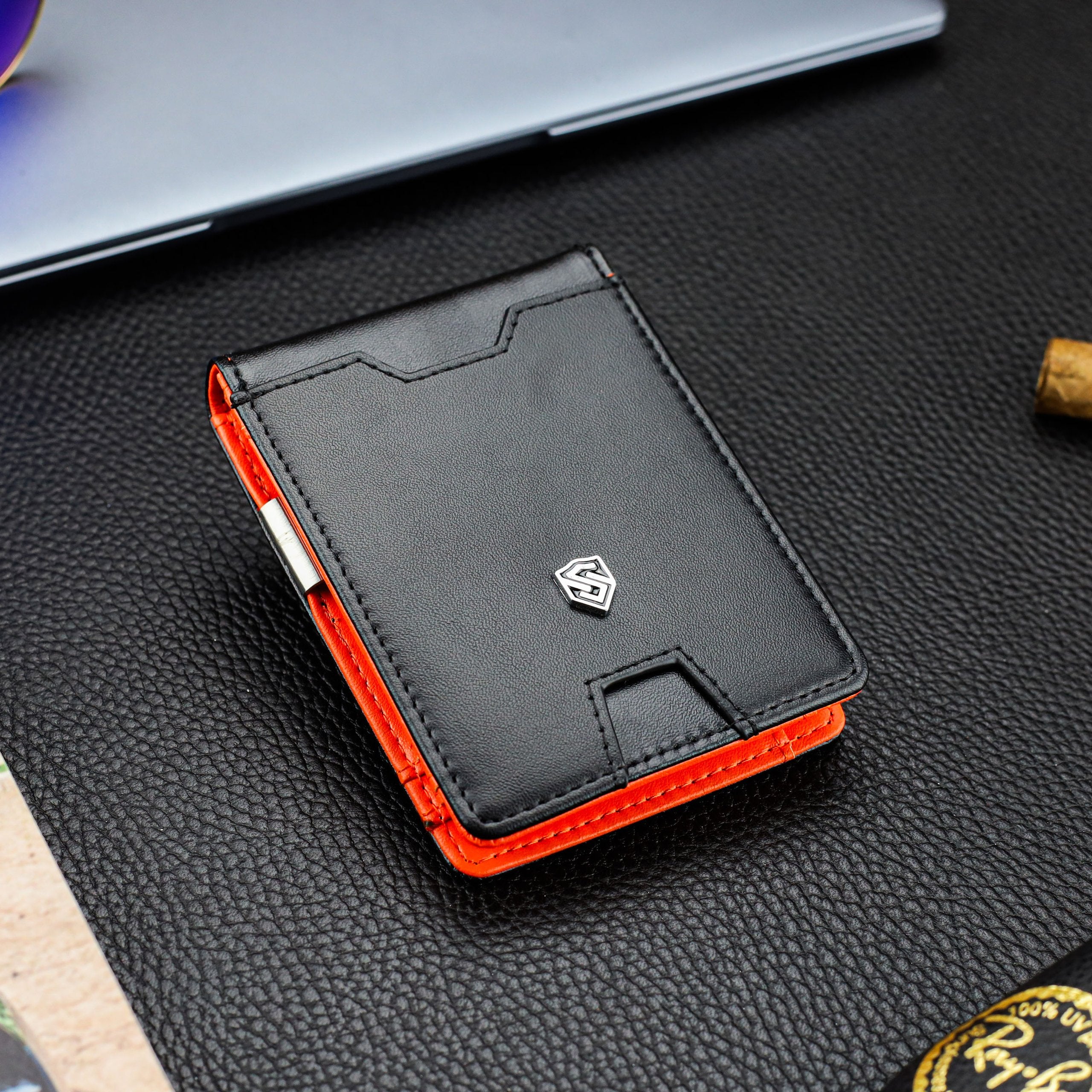 - Ārējais nodalījums: Ātrās piekļuves karšu nodalījums ārpusē ļauj ērti piekļūt kartēm, neatverot maku.