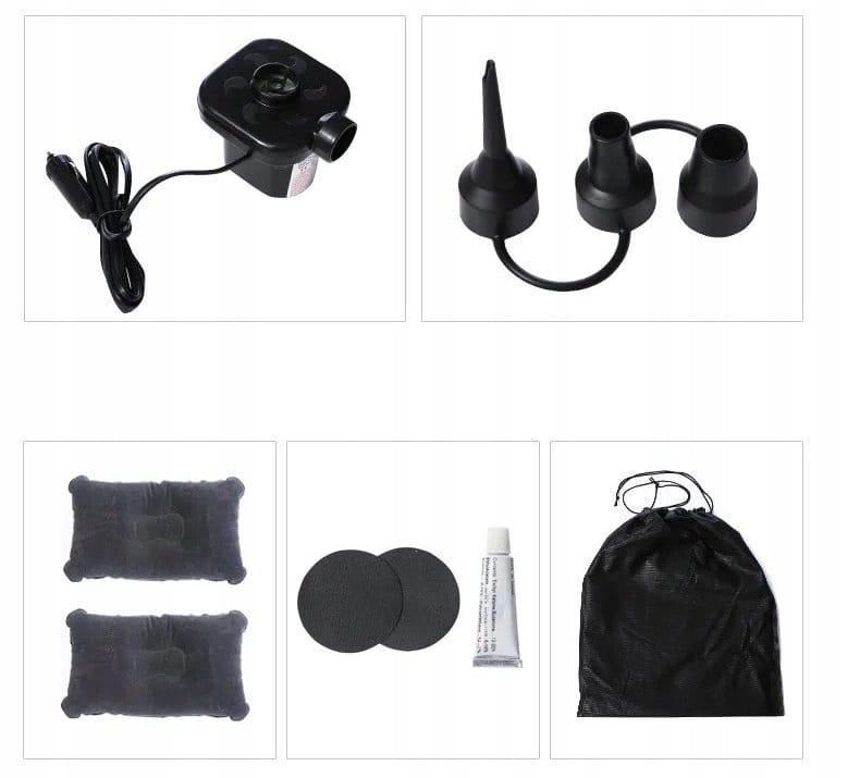 Viss vienā — matracis, pumpis, balsts, spilveni, remonta komplekts un ērta uzglabāšanas/transportēšanas soma.