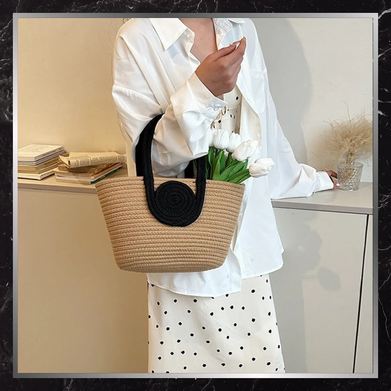 Šī rokassoma ir ideāli piemērota pavasara un vasaras sezonai, piešķirot jūsu tēlam vieglumu un eleganci.
