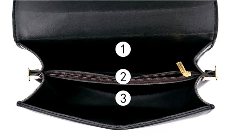 - Iekšpuse: Sadalīta ar rāvējslēdzēja nodalījumu, lai jūsu nepieciešamās lietas būtu kārtīgi atdalītas.