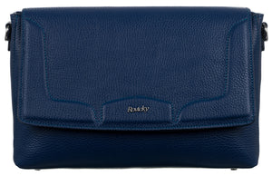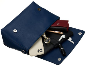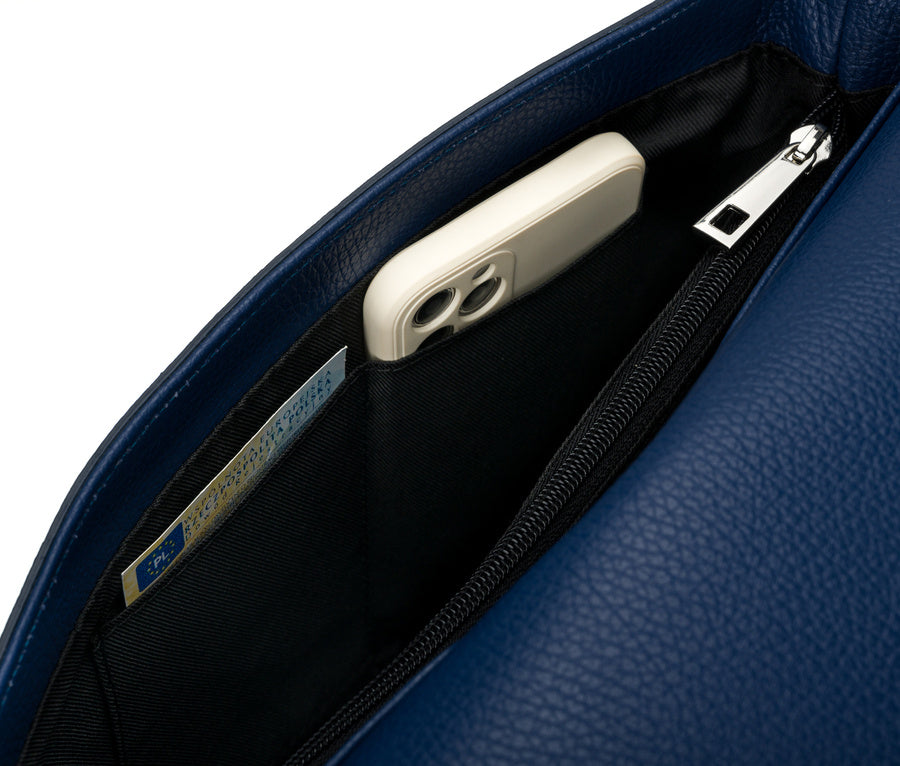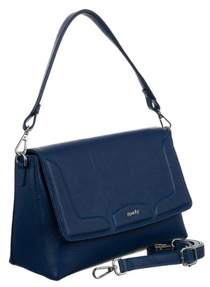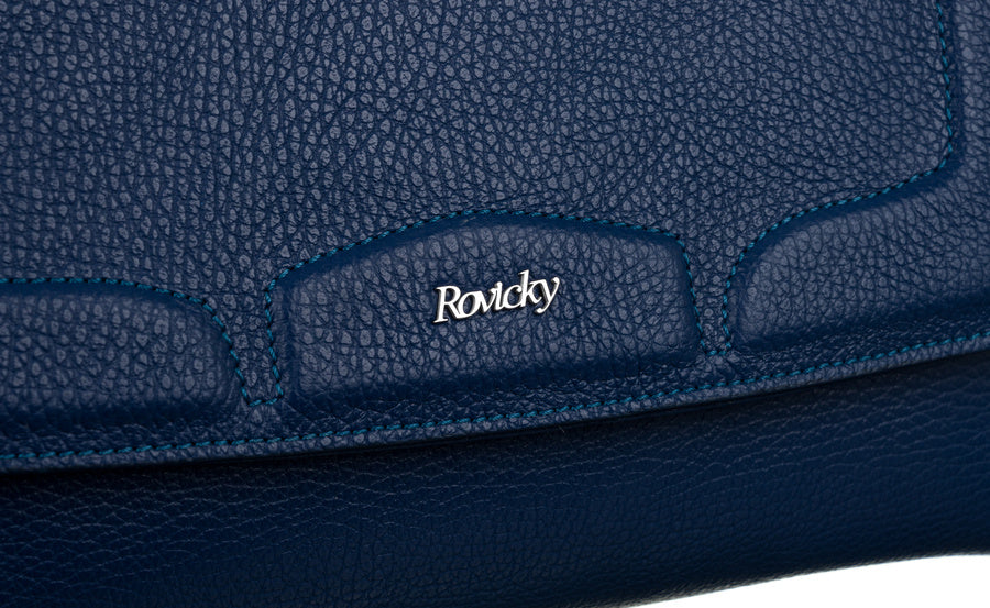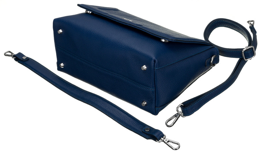 Šī elegantā rokassoma ir izgatavota no augstas kvalitātes īstas ādas, kas nodrošina izturību un stilīgu izskatu. Rokassomas pamatkrāsa ir tumši zila, kas labi sader ar dažādām apģērba kombinācijām.