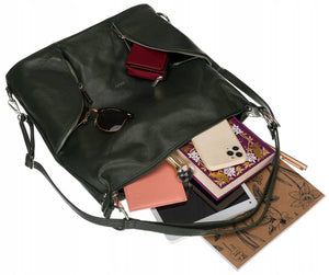 Šī elegantā sieviešu rokassoma ir izgatavota no augstas kvalitātes īstas ādas, kas nodrošina izturību un stilīgu izskatu. Rokassomas pamatkrāsa ir zaļa, kas piešķir jūsu tēlam unikalitāti un svaigumu.
