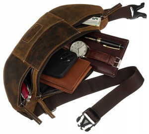 Šī jostas soma ir izgatavota no augstas kvalitātes īstas ādas, kas nodrošina izturību un stilīgu izskatu. Tumši brūnā krāsa piešķir tai eleganci un daudzpusību, padarot somu ideāli piemērotu dažādiem gadījumiem.