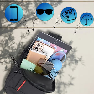 - Gumijas caurums austiņu vadam: ļauj ērti pievienot austiņas tālrunim mugursomas iekšpusē.