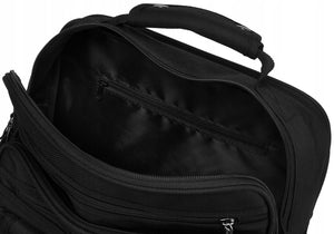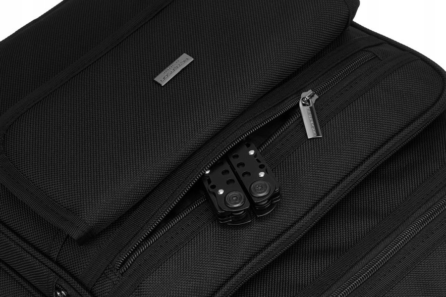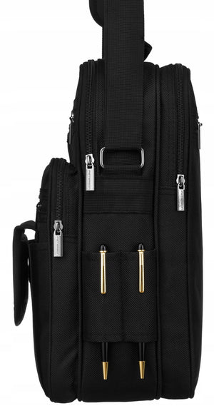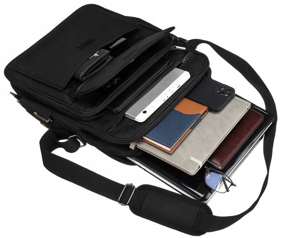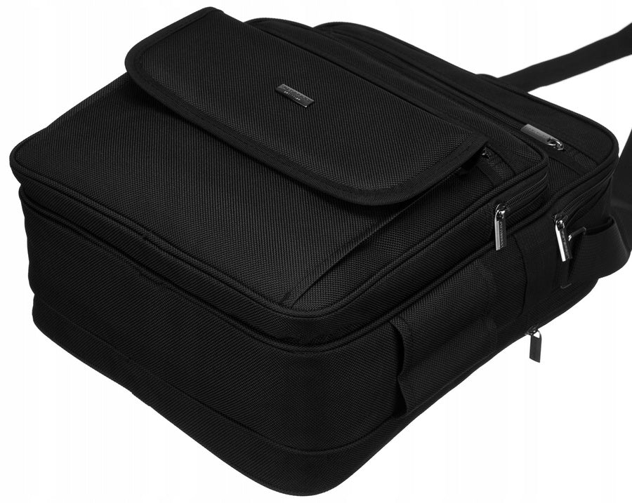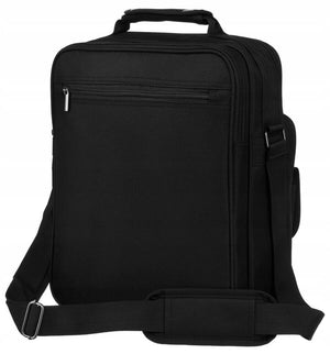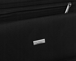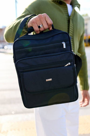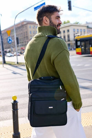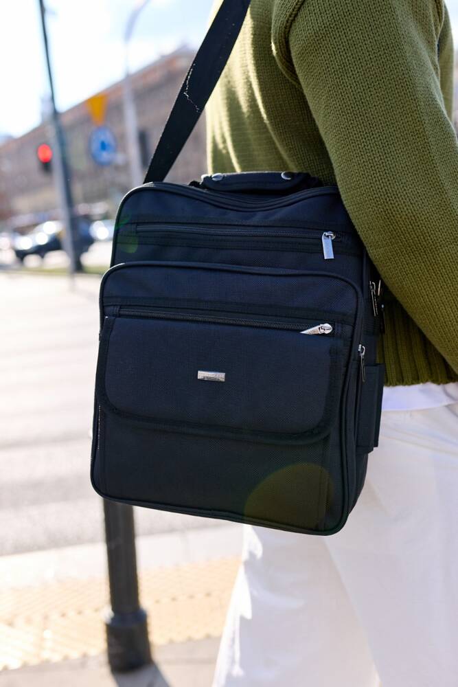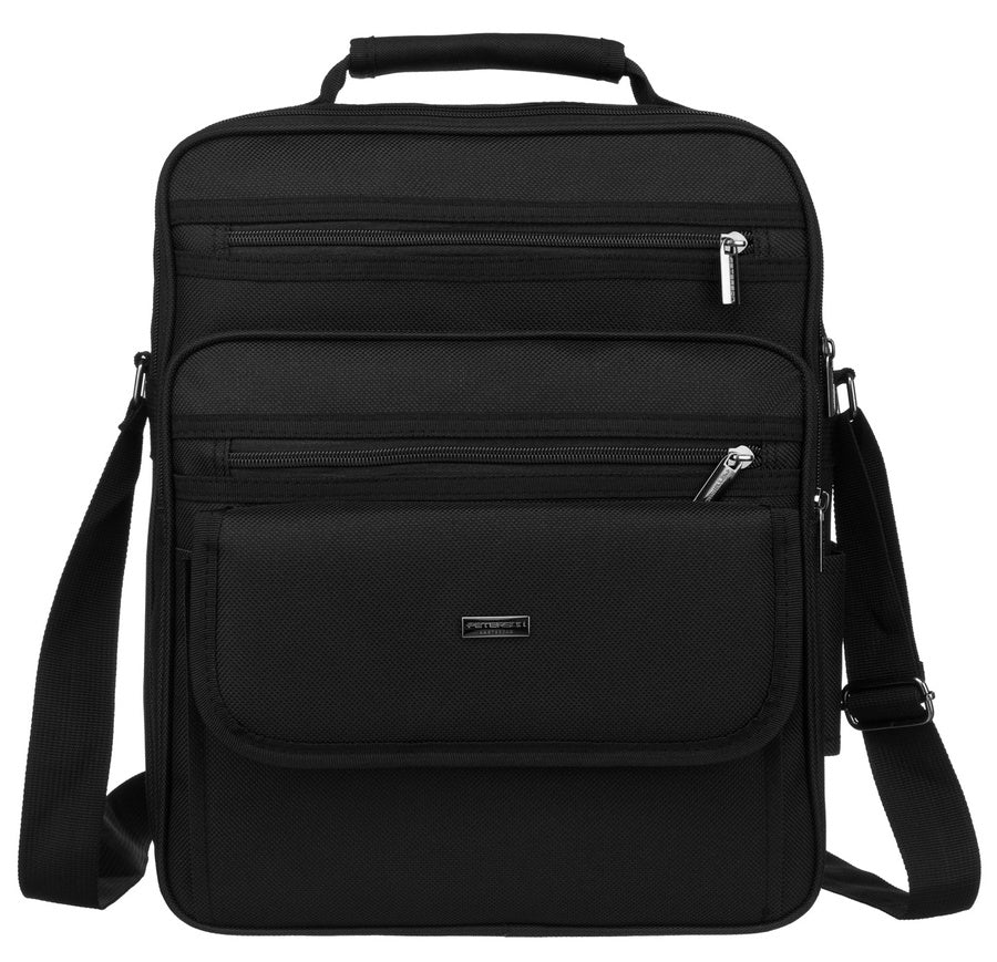 Peterson vīriešu melnā auduma rokassoma ir praktiska izvēle, kas nodrošina komfortu un funkcionalitāti ar vairākām kabatām un regulējamu siksnu.