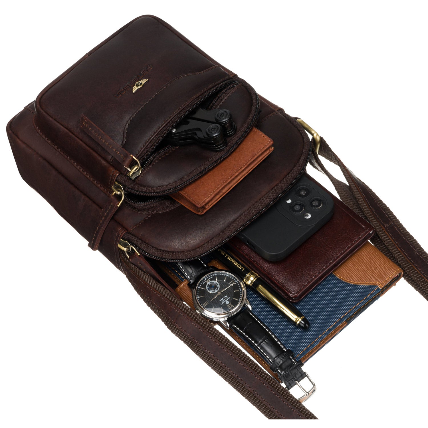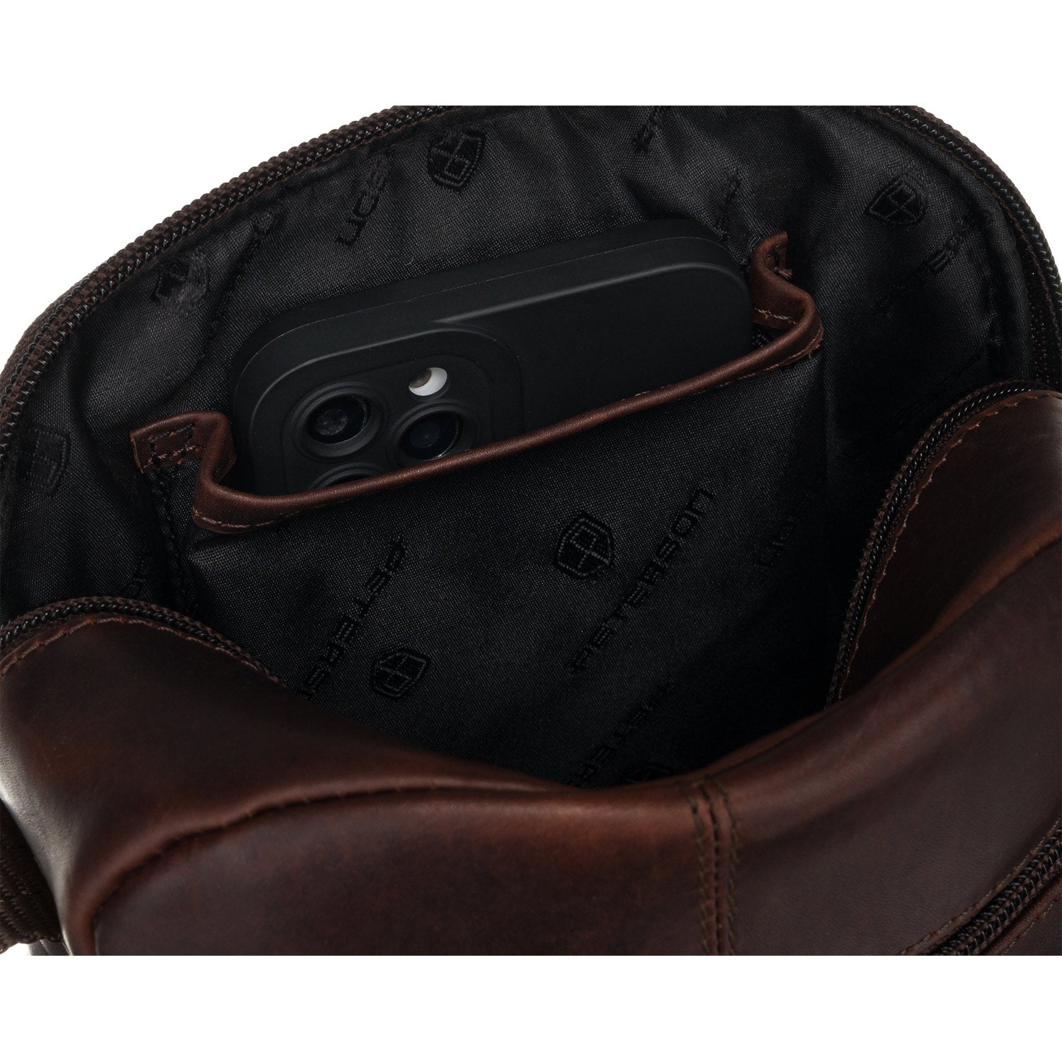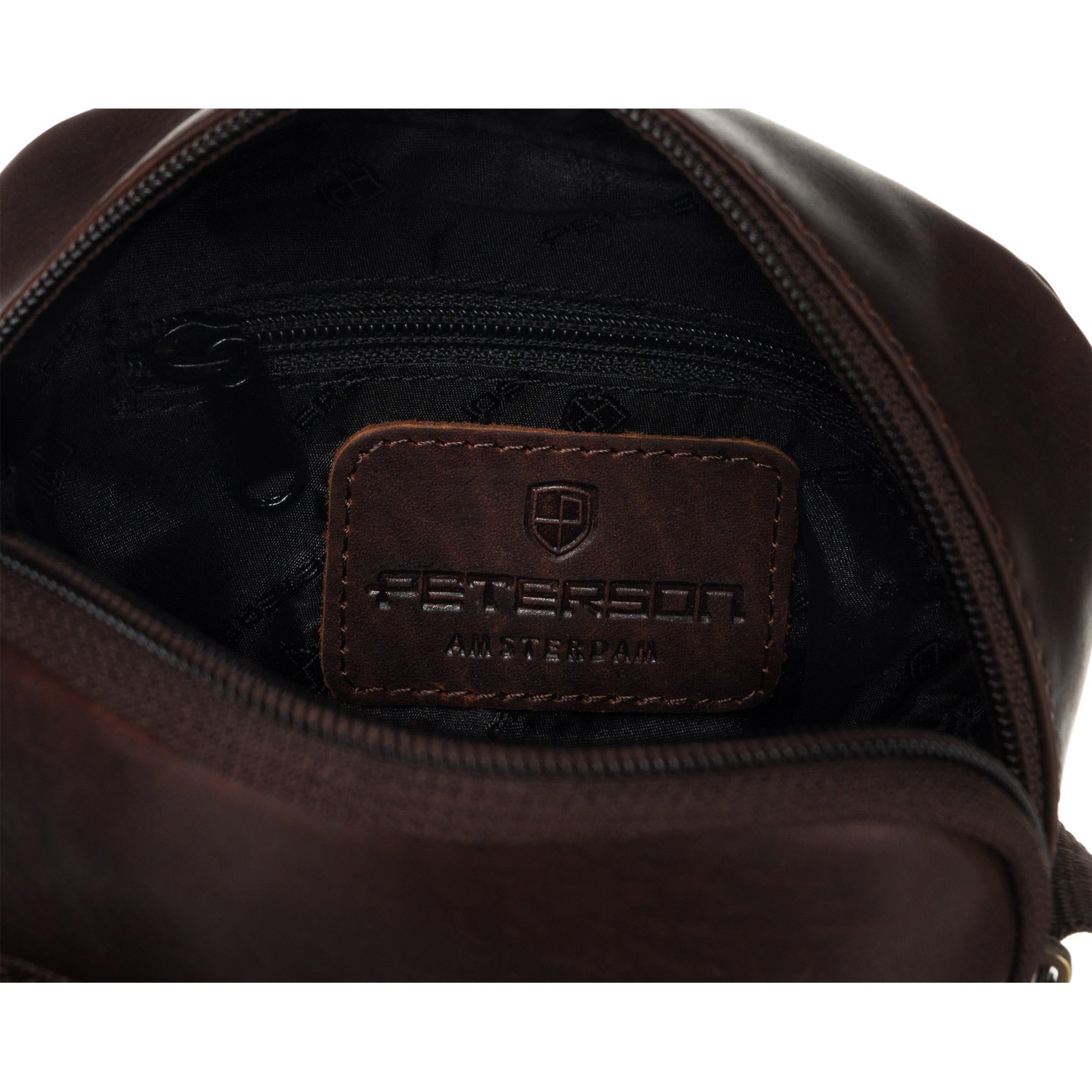 Peterson vīriešu rokassoma, izgatavota no augstas kvalitātes mākslīgās ādas, tumši brūnā krāsā, ideāli piemērota ikdienas lietošanai.