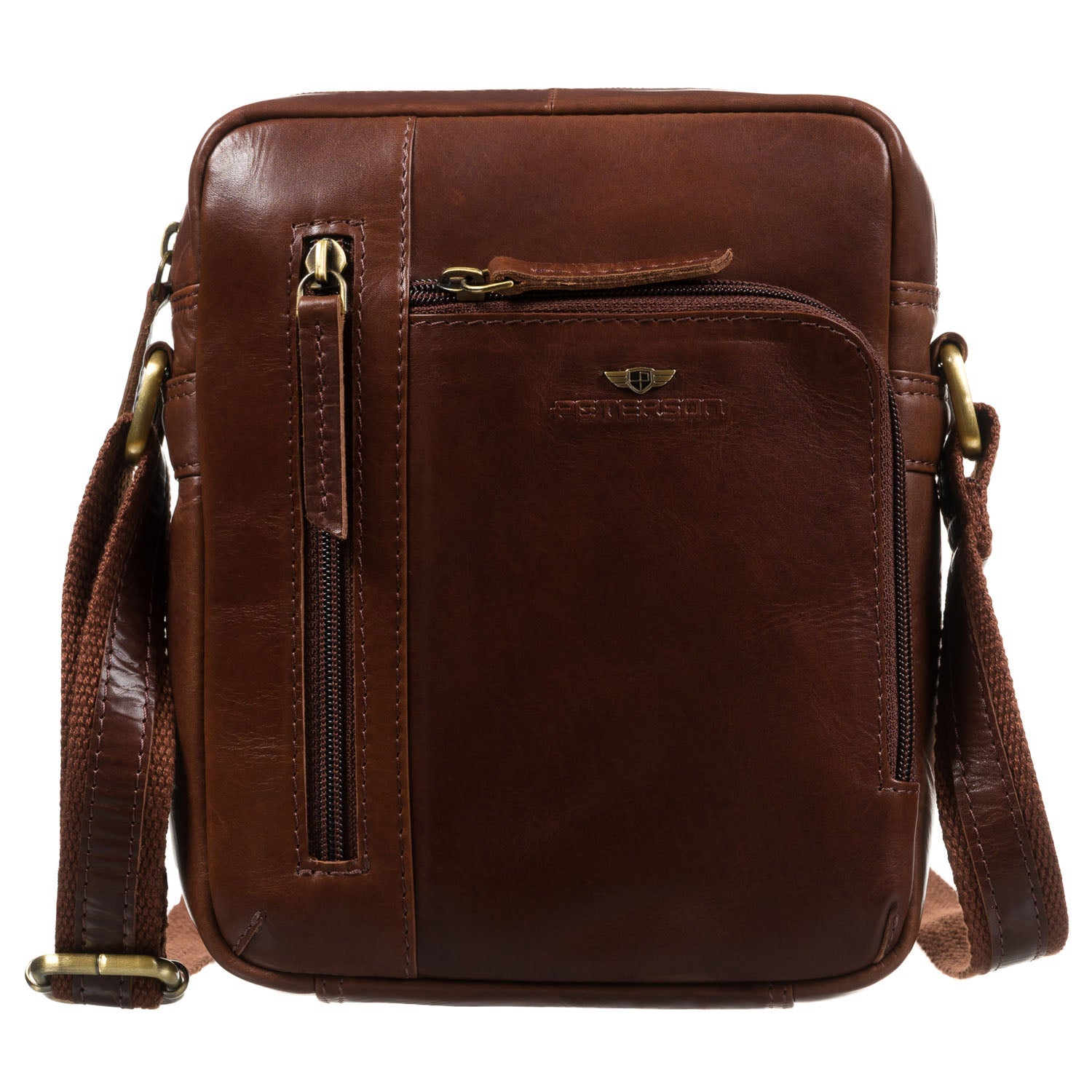 Peterson vīriešu rokassoma, izgatavota no īstas ādas, brūnā krāsā, ideāli piemērota ikdienas lietošanai.