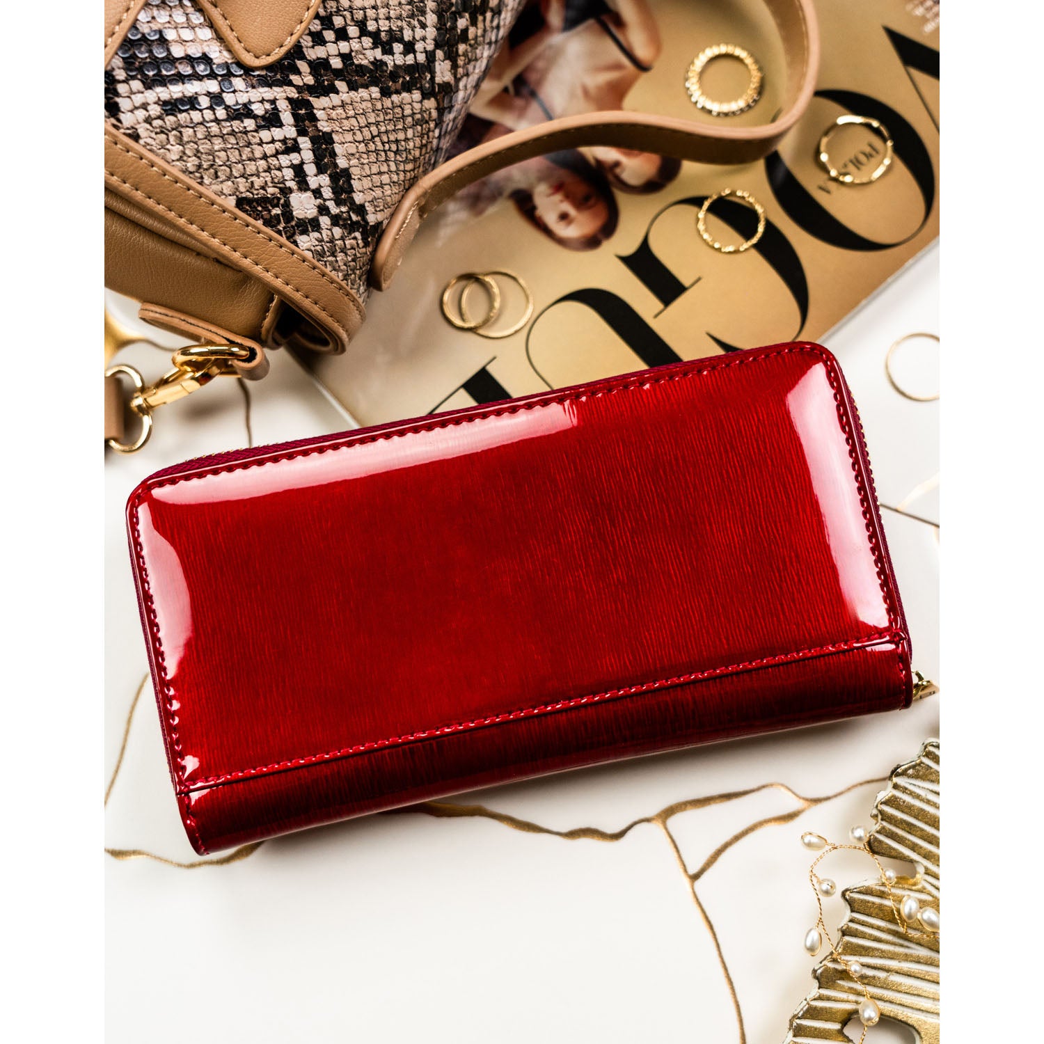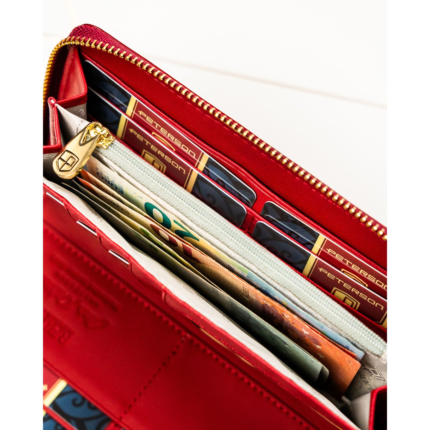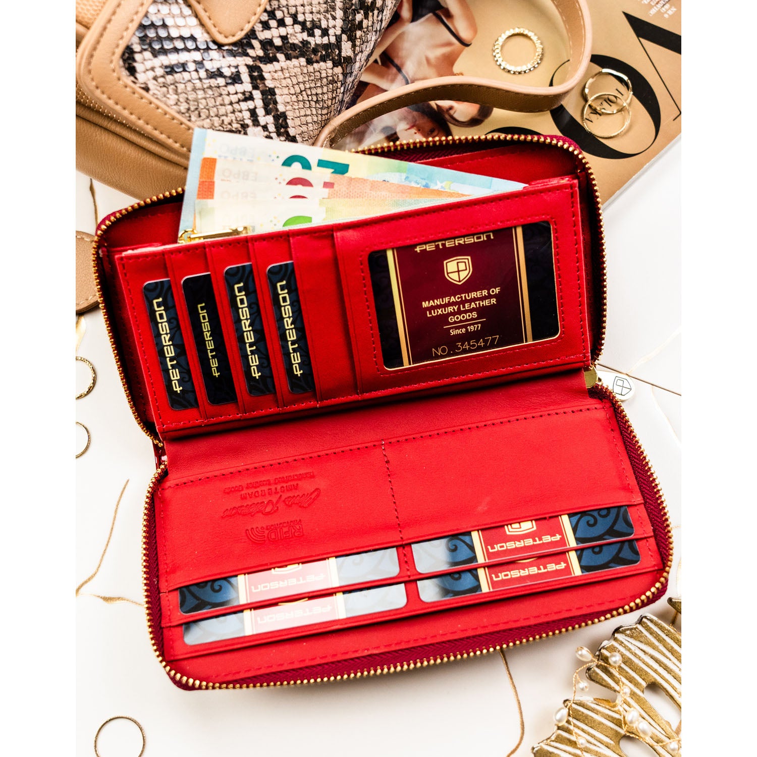 Peterson sarkans sieviešu maks - eleganta izvēle ar RFID aizsardzību.
