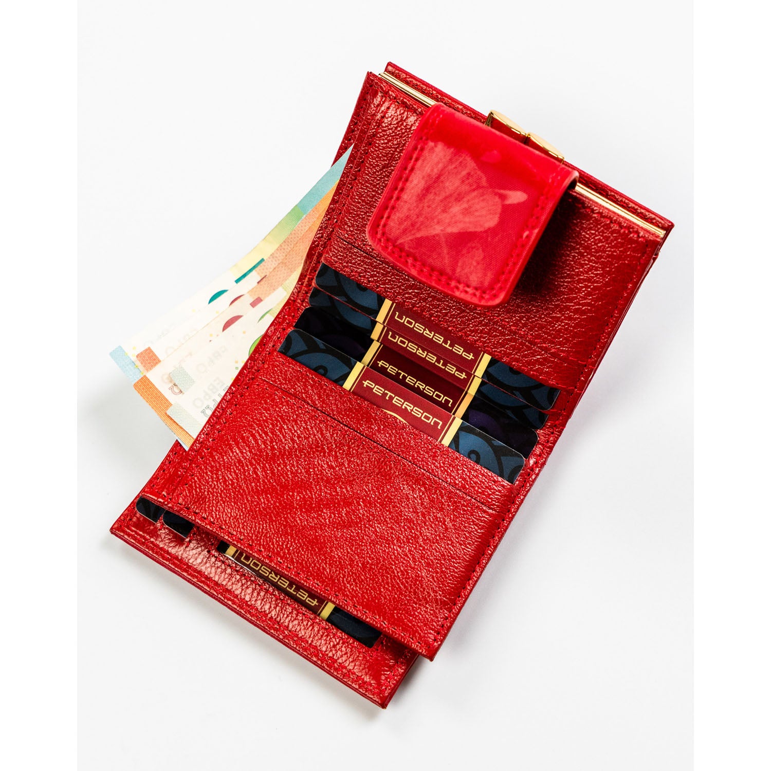 Peterson sarkans sieviešu maks, kas izgatavots no mākslīgās ādas ar RFID aizsardzību.