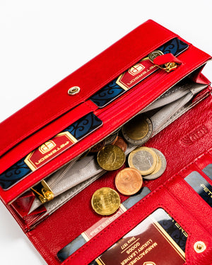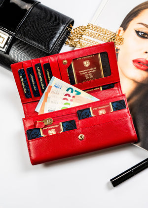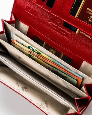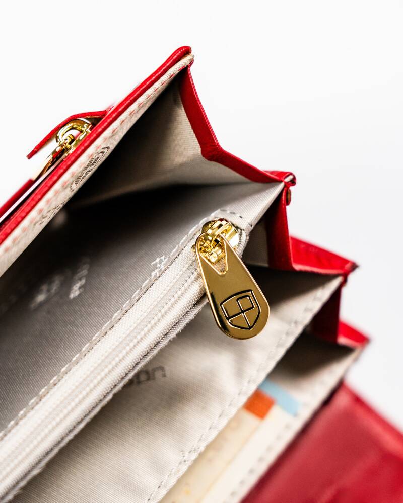 Šis elegantais sieviešu maks, kas izgatavots no īstas ādas, ir ne tikai stilīgs, bet arī praktisks. Pateicoties integrētajai RFID aizsardzībai, jūsu kartes būs pasargātas no nevēlamas skenēšanas. Sarkanā krāsa piešķir unikalitāti, un lielais izmērs nodrošina, ka viss nepieciešamais atrodas vienuviet.