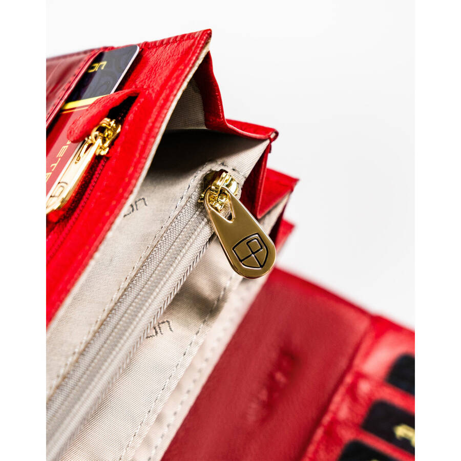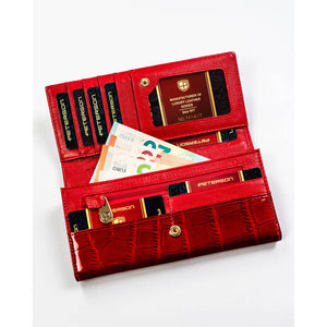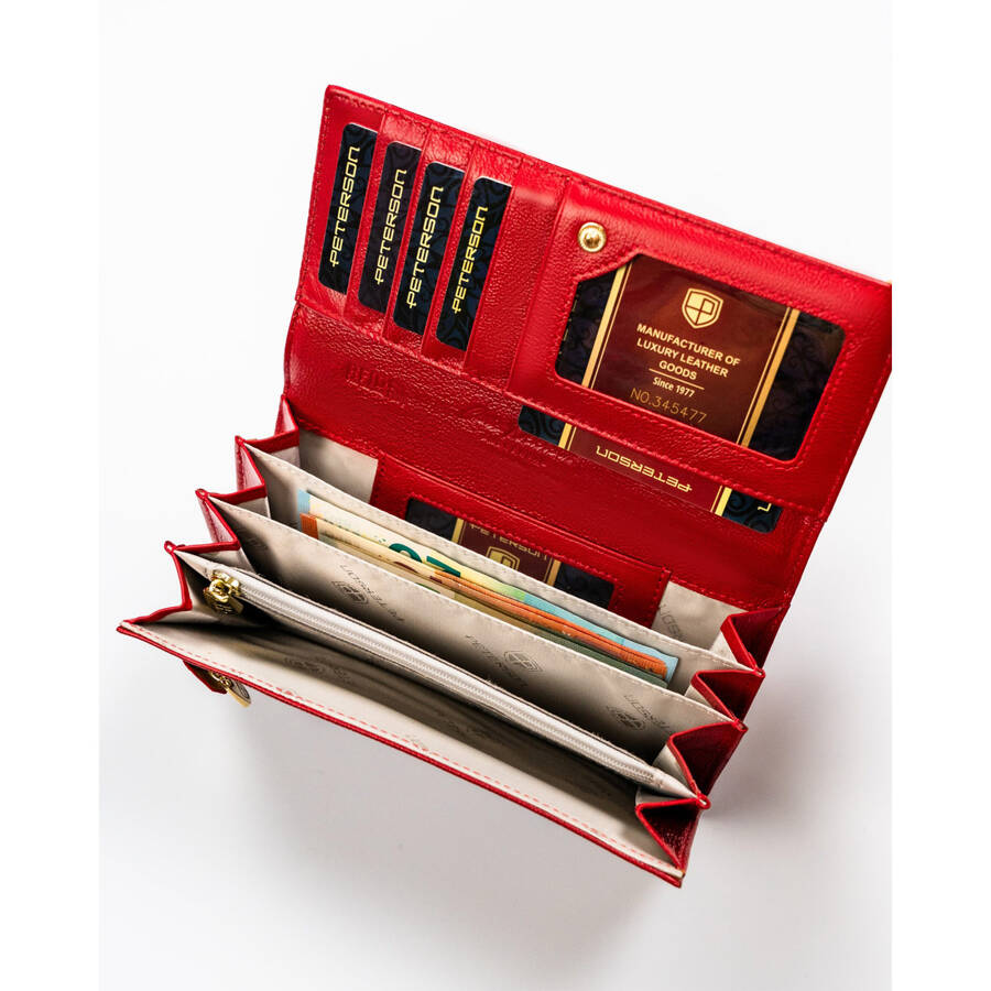 Šis elegantais sieviešu maks no Peterson kolekcijas ir izgatavots no augstas kvalitātes īstas lakotas ādas. Spilgti sarkanā krāsa piešķir ekskluzivitāti un stilu. Lielais izmērs nodrošina, ka jums būs pietiekami daudz vietas visām jūsu kartēm un skaidrai naudai. Makam ir arī RFID aizsardzība, kas palīdzēs aizsargāt jūsu personas datus no neatļautas skenēšanas. Ar 6-10 karšu nodalījumiem šis maks ir praktiska un stilīga izvēle ikvienai sievietei.