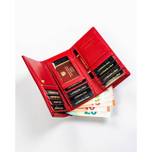Šis elegantais sieviešu maks, kas izgatavots no īstas lakotas ādas, ir ne tikai stilīgs, bet arī funkcionāls. Sarkanā krāsa piešķir tam ekskluzivitāti, un vidējais izmērs nodrošina ērtības ikdienas lietošanā. Makam ir vairāk nekā 10 karšu nodalījumi, tāpēc tajā var ērti ievietot visas nepieciešamās kartes. Turklāt integrētā RFID aizsardzība palīdzēs aizsargāt jūsu personas datus no neatļautas nolasīšanas.