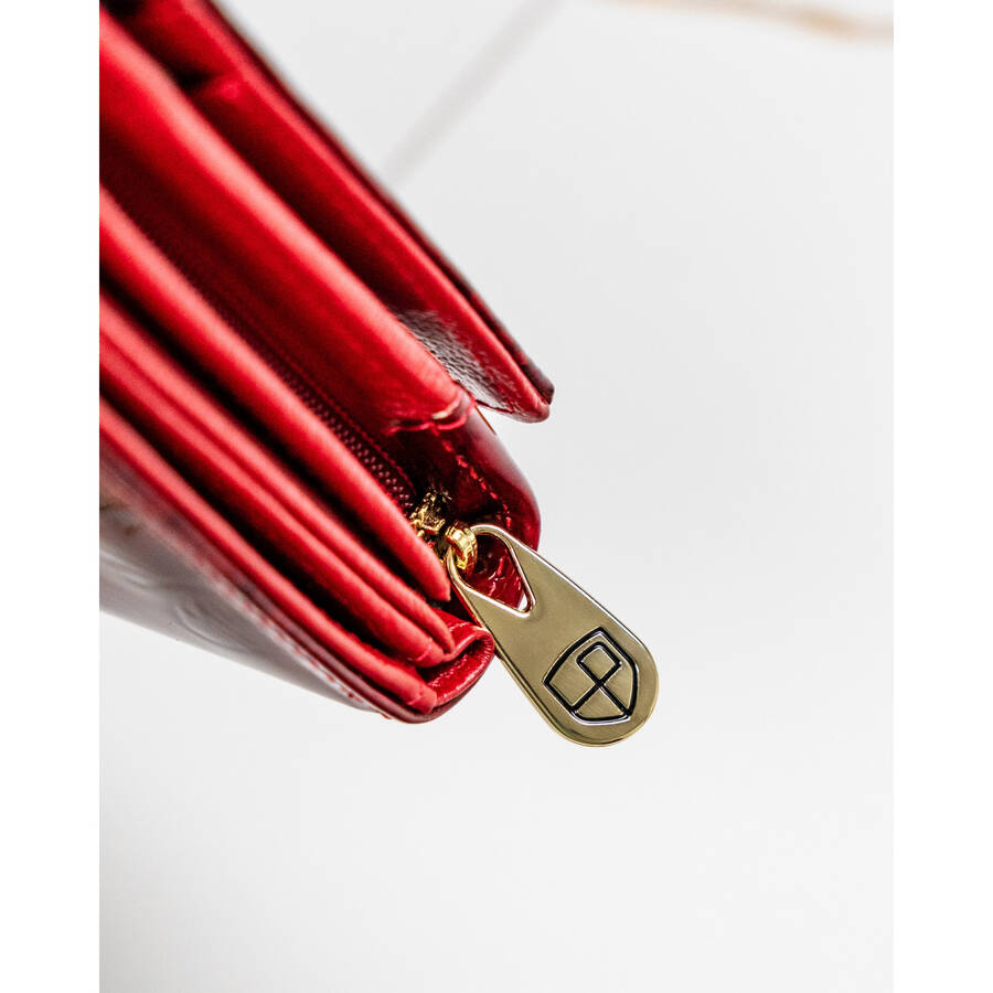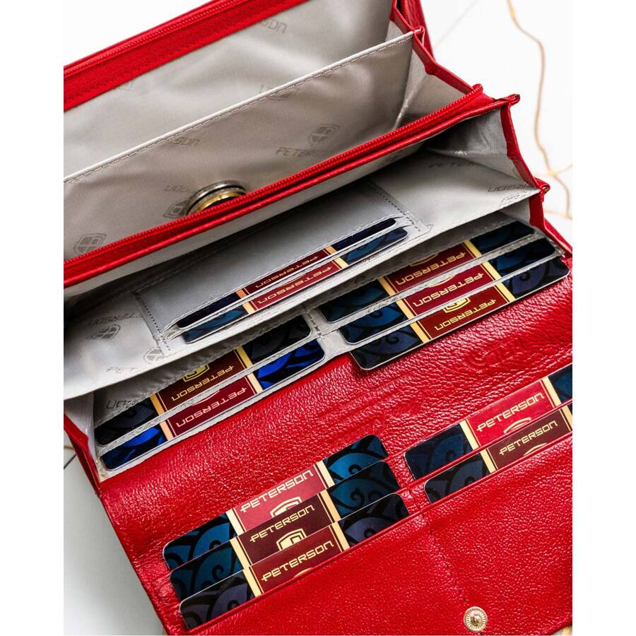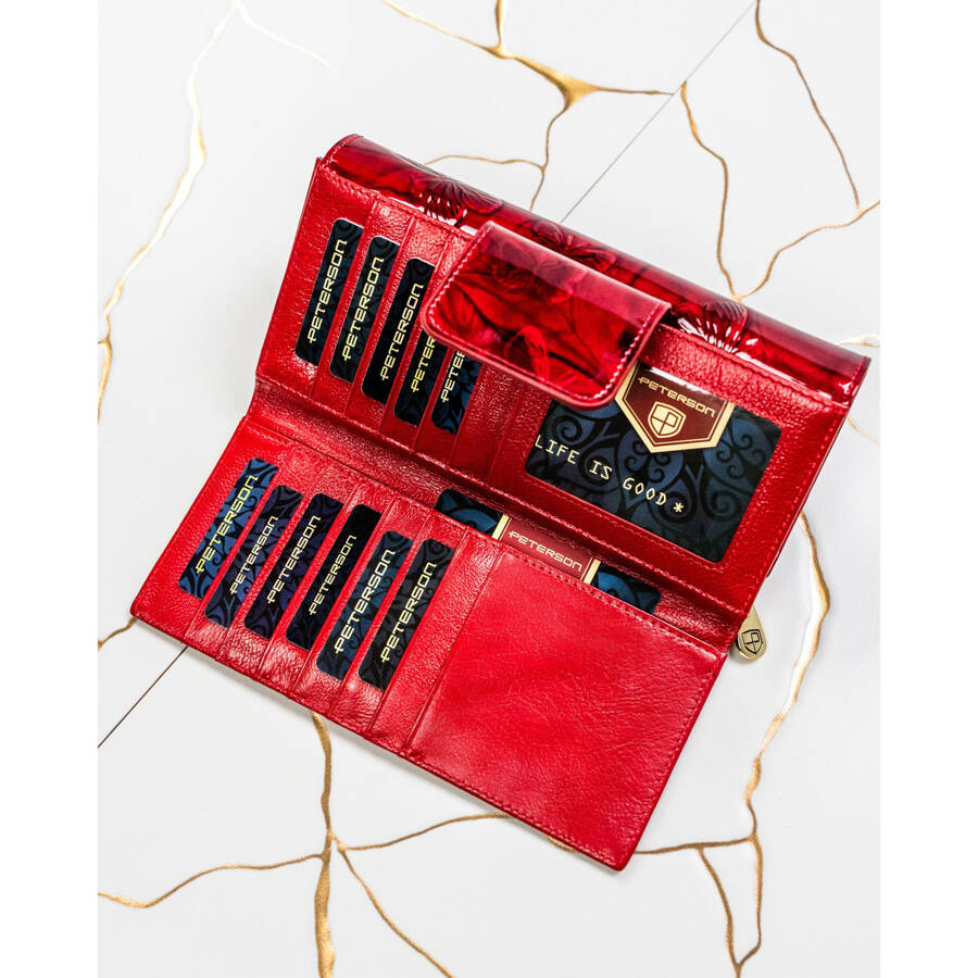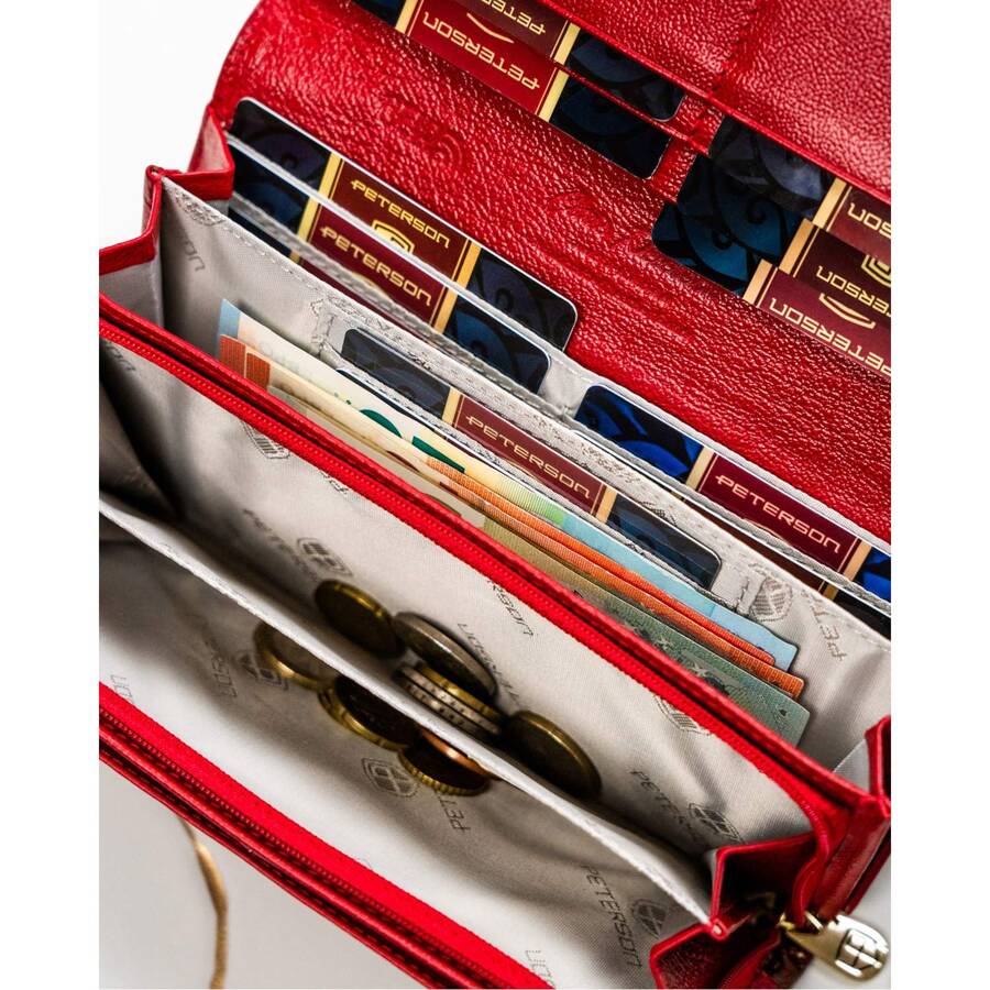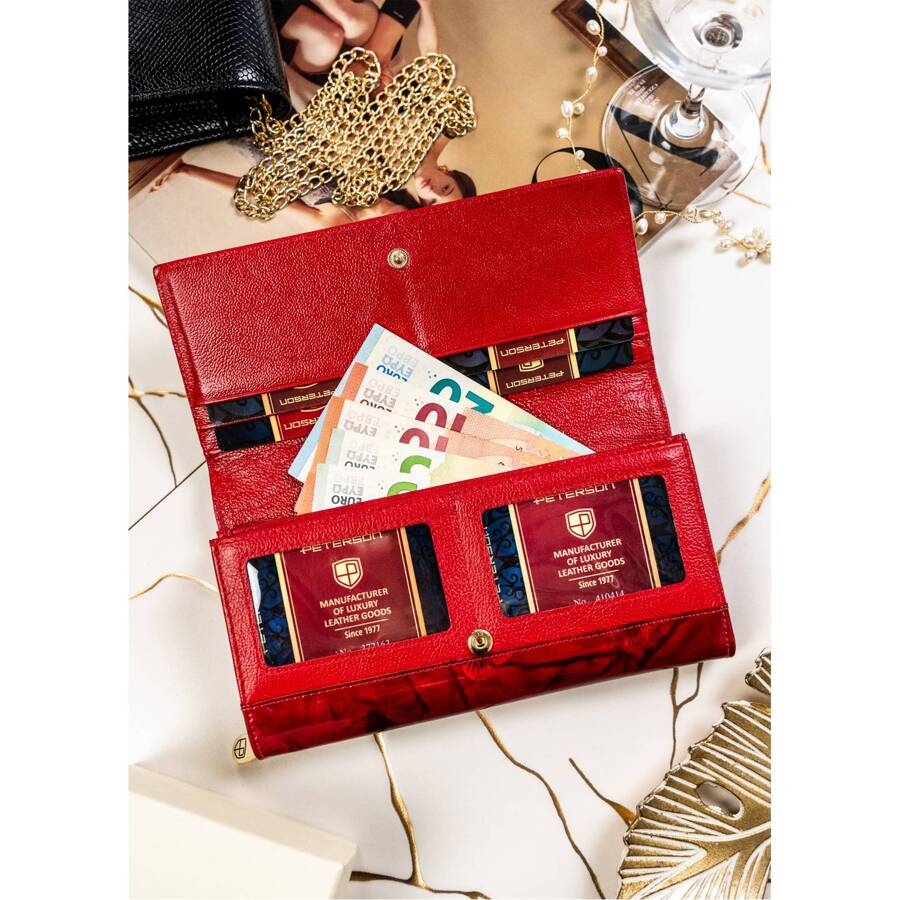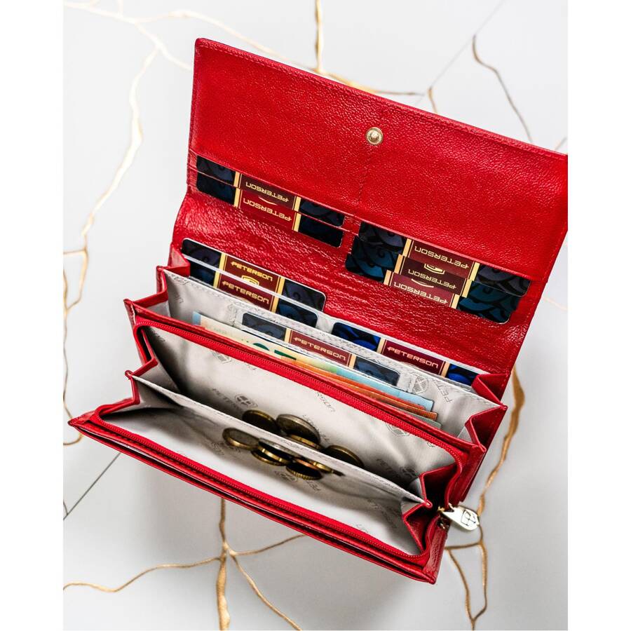 Šis elegantais sieviešu maks no Peterson kolekcijas ir izgatavots no augstas kvalitātes īstas un lakotas ādas. Tā spilgti sarkanā krāsa piešķir tam ekskluzivitāti un stilu.