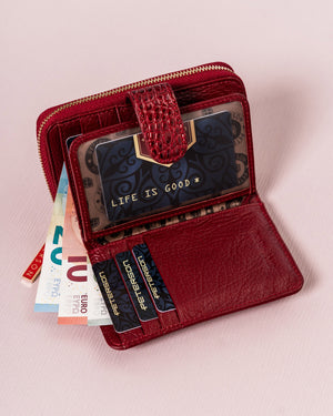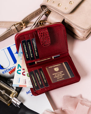 Šis elegantais sieviešu maks no Peterson kolekcijas ir izgatavots no augstas kvalitātes īstas lakotas ādas. Tā spilgti sarkanā krāsa piešķir tam ekskluzivitāti un stilu.