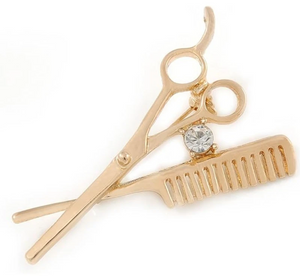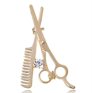 Šai brošai ir unikāls dizains, kas apvieno šķēru un ķemmes motīvus, padarot to par lielisku izvēli frizieriem vai matu veidošanas entuziastiem. Spīdīgi mākslīgie akmentiņi piešķir nelielu mirdzumu, piešķirot izsmalcinātību un eleganci.