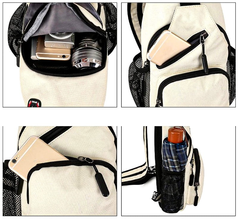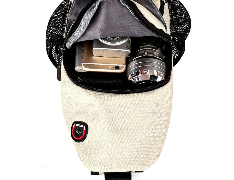 - Gumijas atvere austiņu vadam: ļauj ērti pievienot austiņas tālrunim mugursomas iekšpusē.