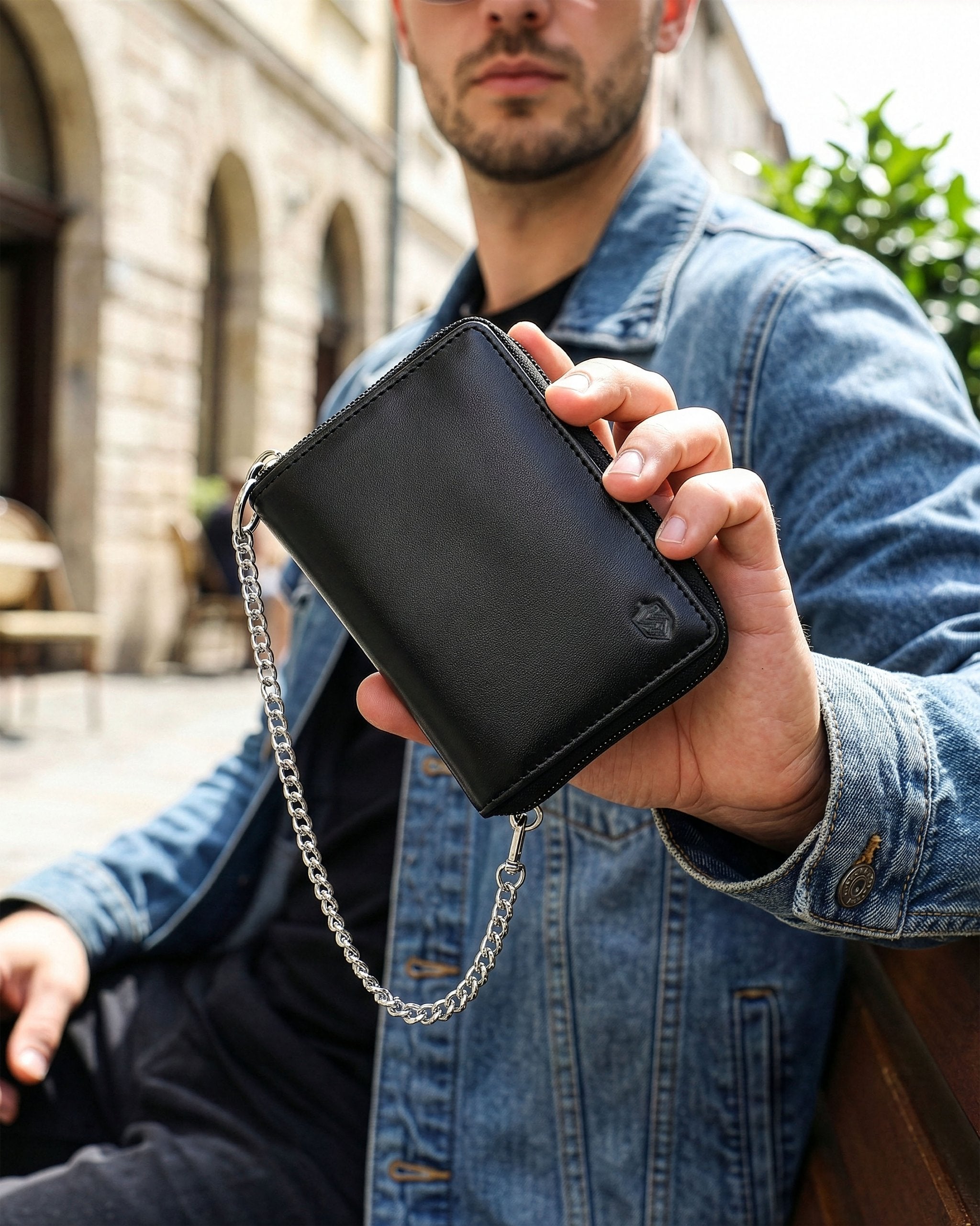 Vīriešu ādas maks ar rāvējslēdzēju un ķēdīti Stevens