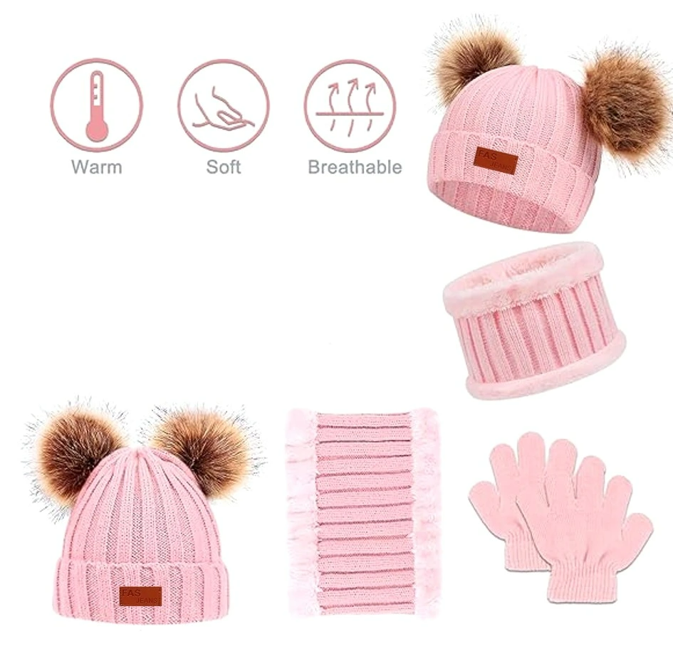Šis trīsdaļīgais bērnu komplekts, kas sastāv no cepures, šalles un cimdiem, ir lieliska izvēle aukstajam gadalaikam. Komplekts ir izgatavots no 100% akrila šķiedras, kas ir elastīga, elastīga, mīksta un silta.