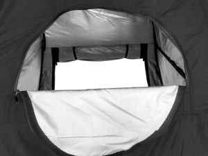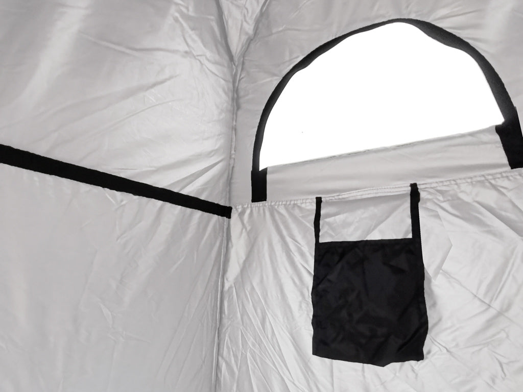 Priekšpusē ir rāvējslēdzēja ieeja. Aizmugurē ir neliels logs, arī ar rāvējslēdzēju, kas lieliski kalpo kā logs. Teltij nav grīdas.