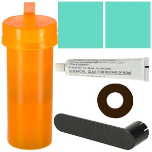 - 1x remonta komplekts (3 ielāpi: 2x tirkīza – 13 x 10,5 cm, 1x zils apaļš – 8 cm, līme, SUP atslēga)