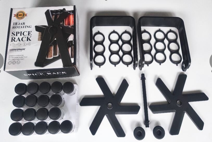 Rotējošs garšvielu organizators. Ļauj ērti sakārtot visbiežāk izmantotās garšvielas. Komplektā ietilpst 18 skrūvējamas burciņas. Organizators ir matēti melns, tāpēc tas eleganti izskatīsies uz jūsu virtuves letes. Rotējošais dizains atvieglo garšvielu sasniegšanu.