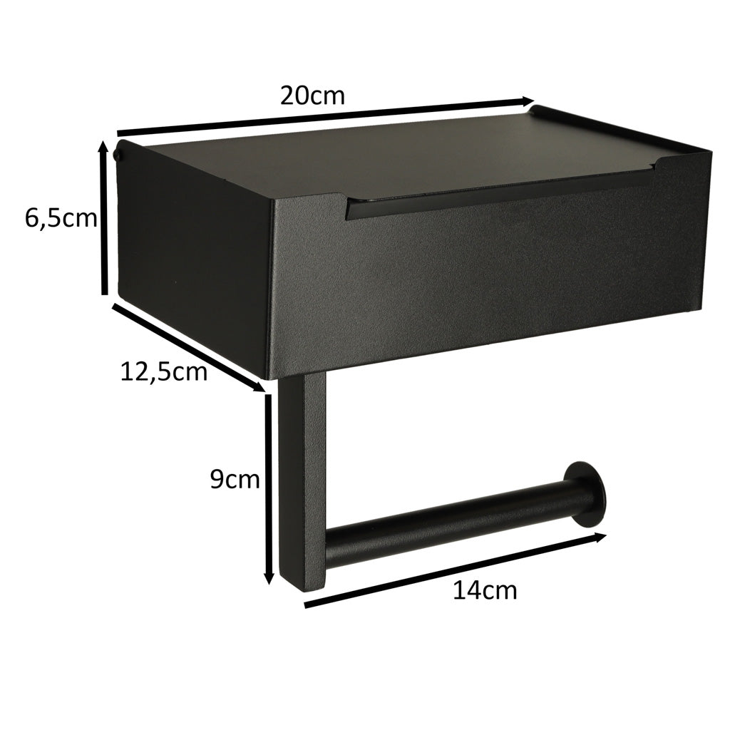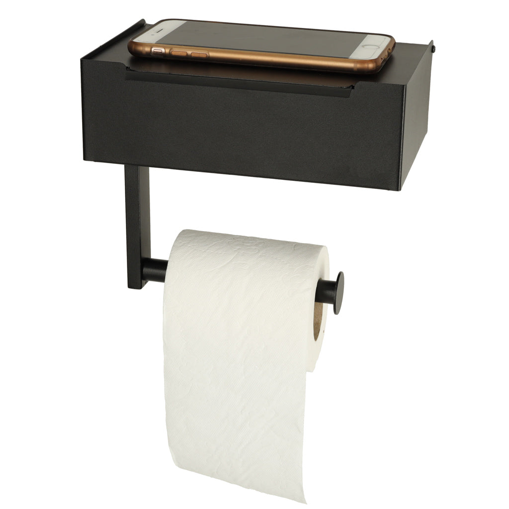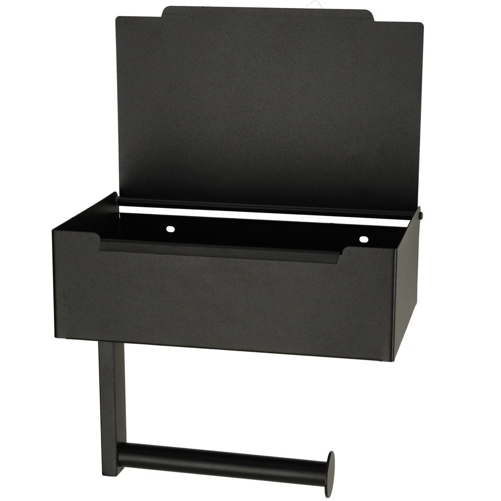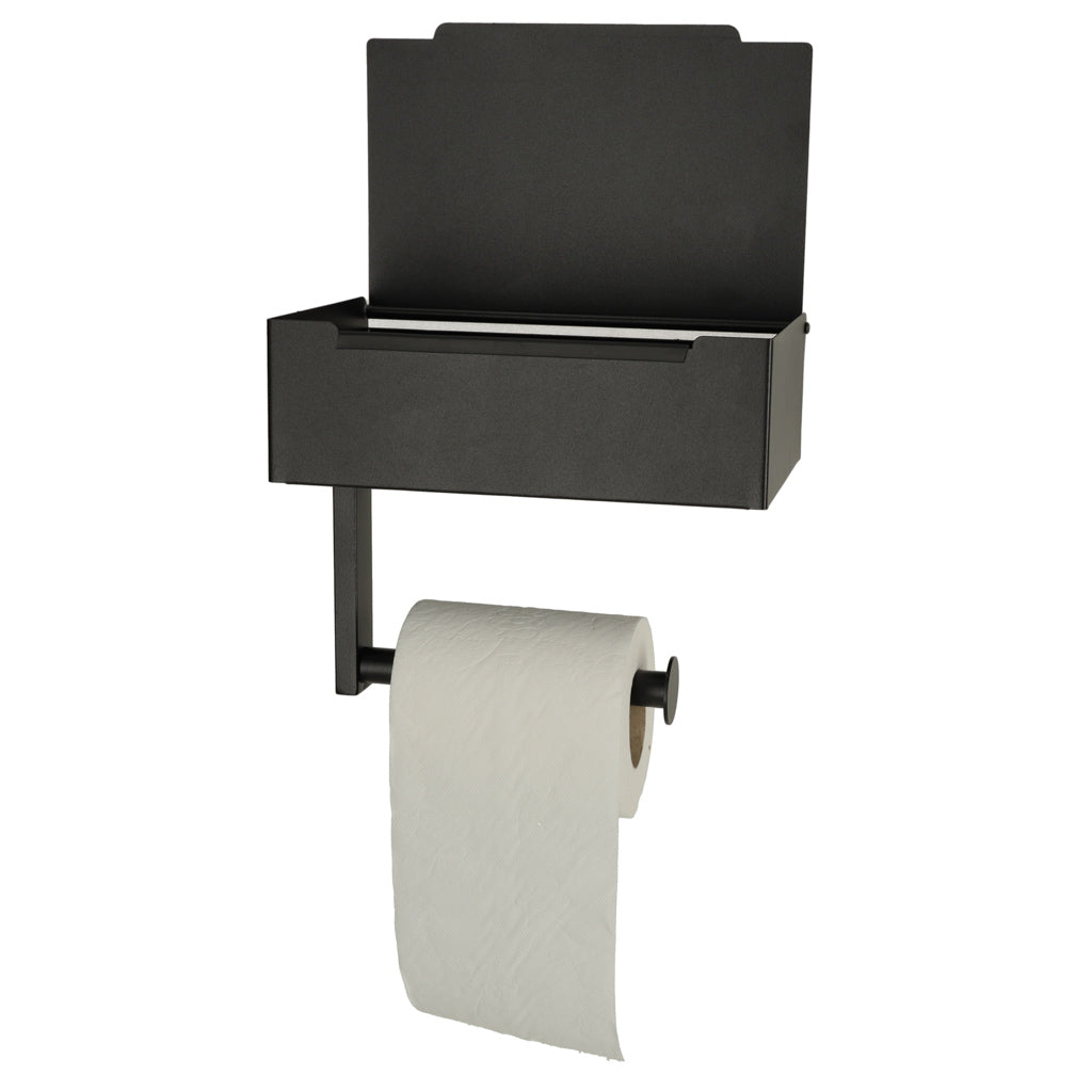 Praktisks tualetes papīra turētājs ar papildu vietu, piemēram, mitrajām salvetēm. Nodalījumu var izmantot arī kā gaisa atsvaidzinātāju vai telefona plauktu. Rokturis matēti melnā krāsā. Atvērtā puse atvieglo papīra ruļļa nomaiņu.