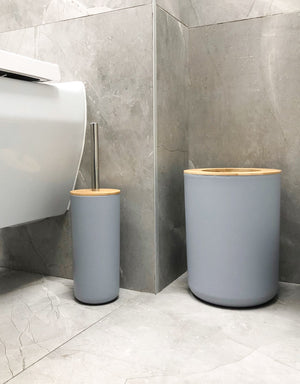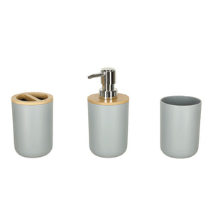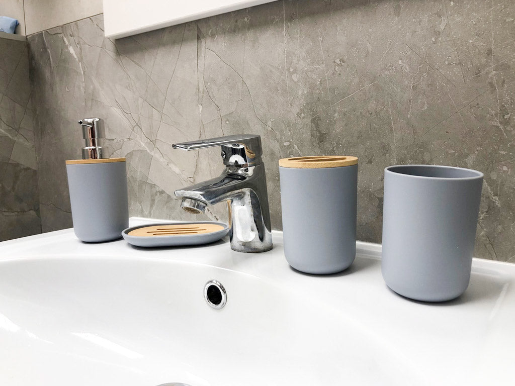 Pelēkais vannas istabas komplekts ir lieliska izvēle jebkurai vannas istabai. Pateicoties klasiskajam dizainam un universālajai krāsai, komplekts lieliski iederēsies jebkurā interjerā. Turklāt koka detaļas padara to vēl elegantāku. Sešu daļu komplektā ietilpst visi nepieciešamie aksesuāri: ziepju trauks, ziepju dozators, zobu birstes turētājs, krūze, tualetes birste un atkritumu tvertne.