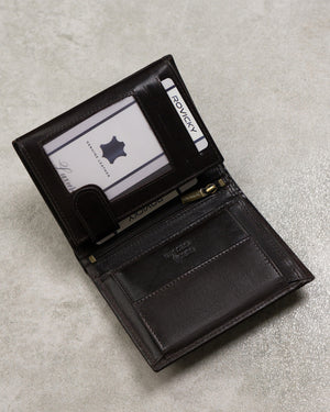 Šis vīriešu maks no Rovicky ir izgatavots no augstas kvalitātes īstas ādas, kas nodrošina izturību un eleganci. Tumši brūnā krāsa piešķir tam klasisku un stilīgu izskatu.
