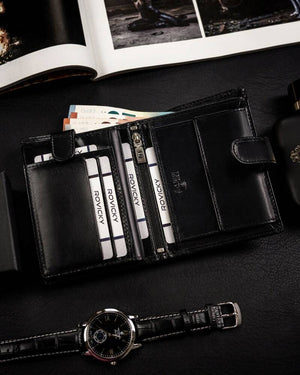 Šis elegantais vīriešu maks no Rovicky ir izgatavots no augstas kvalitātes īstas ādas, kas nodrošina izturību un stilīgu izskatu. Melnais dizains piešķir tam klasisku un daudzpusīgu izskatu, kas piemērots jebkuram gadījumam.