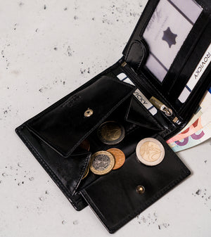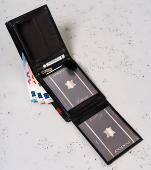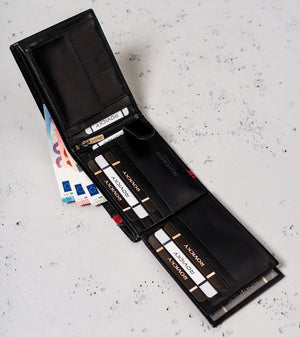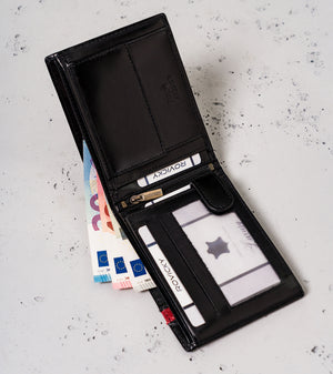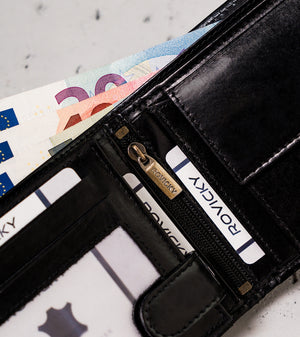Šis elegantais vīriešu maks no Rovicky ir izgatavots no augstas kvalitātes īstas ādas, kas nodrošina izturību un stilīgu izskatu. Melnā krāsa piešķir tam klasisku un daudzpusīgu izskatu, kas piemērots jebkuram gadījumam.