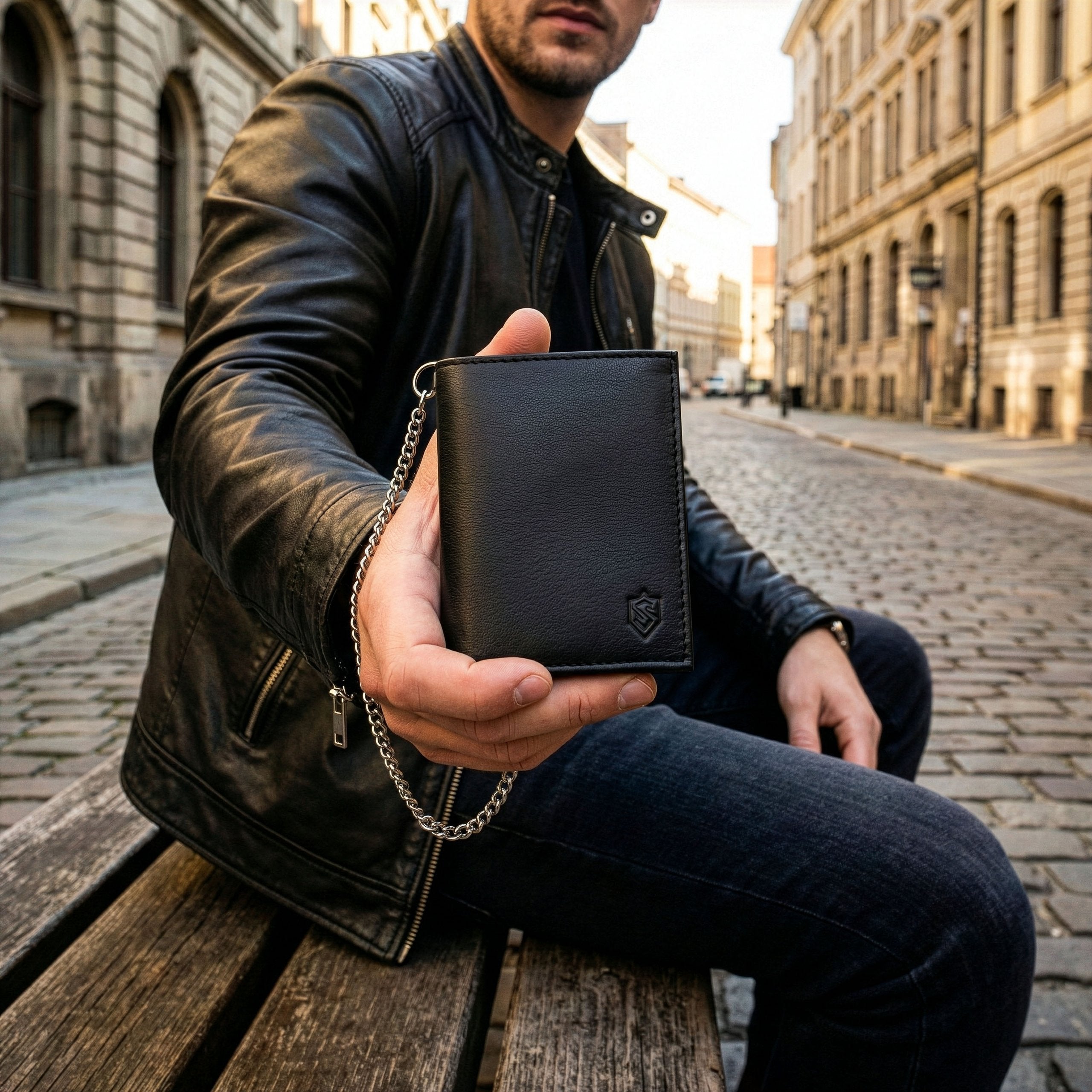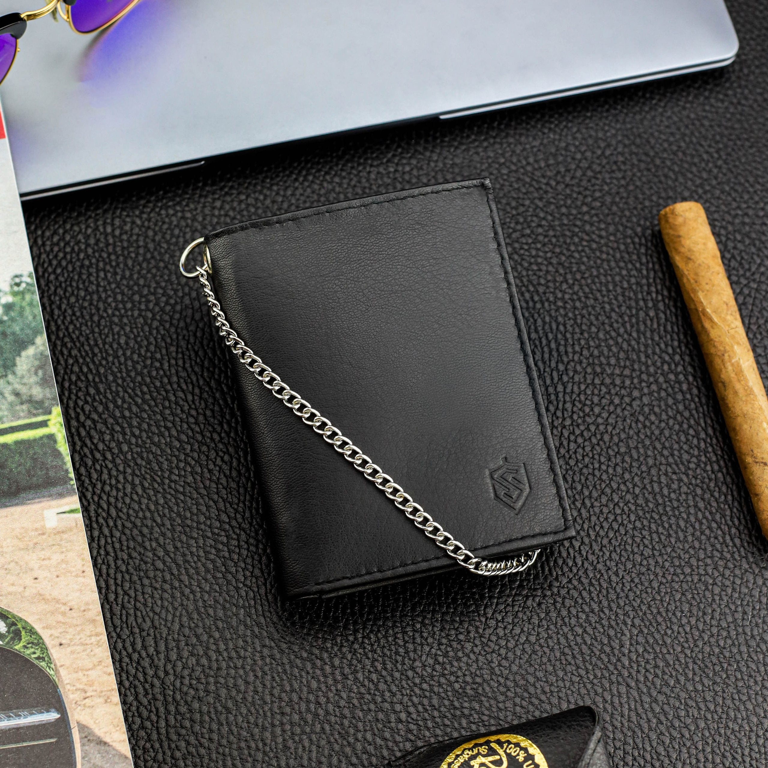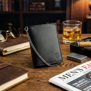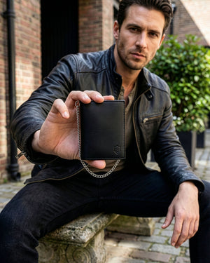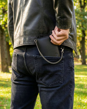 Šis vīriešu ādas maks ir ne tikai stilīgs, bet arī funkcionāls. Tas ir izgatavots no augstas kvalitātes īstas kazas ādas, un tā dizainu papildina 50 cm gara metāla ķēdīte ar karabīni papildu drošībai.
