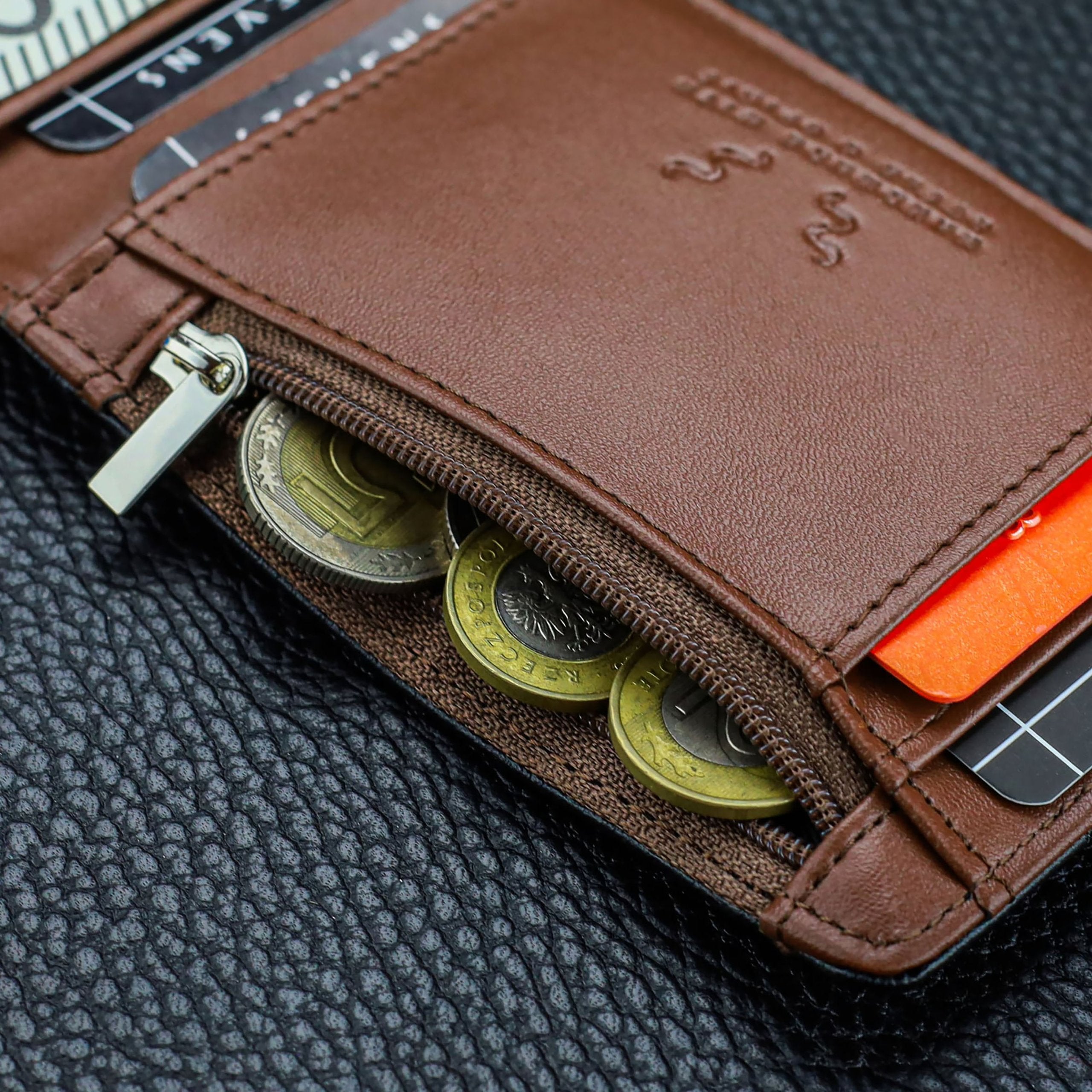 - Ārējais nodalījums: Ātrās piekļuves karšu nodalījums ārpusē ļauj ērti piekļūt kartēm, neatverot maku.