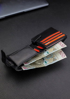 Horizontāls vīriešu maks no viegli pulētas dabīgās ādas. Kompakts, kārtīgs un elegants ikdienai. Izmēri: 8,5 × 10,5 × 2,8 cm. Iekšpusē – atloks ar sprādzi, kas stabilizē saturu.