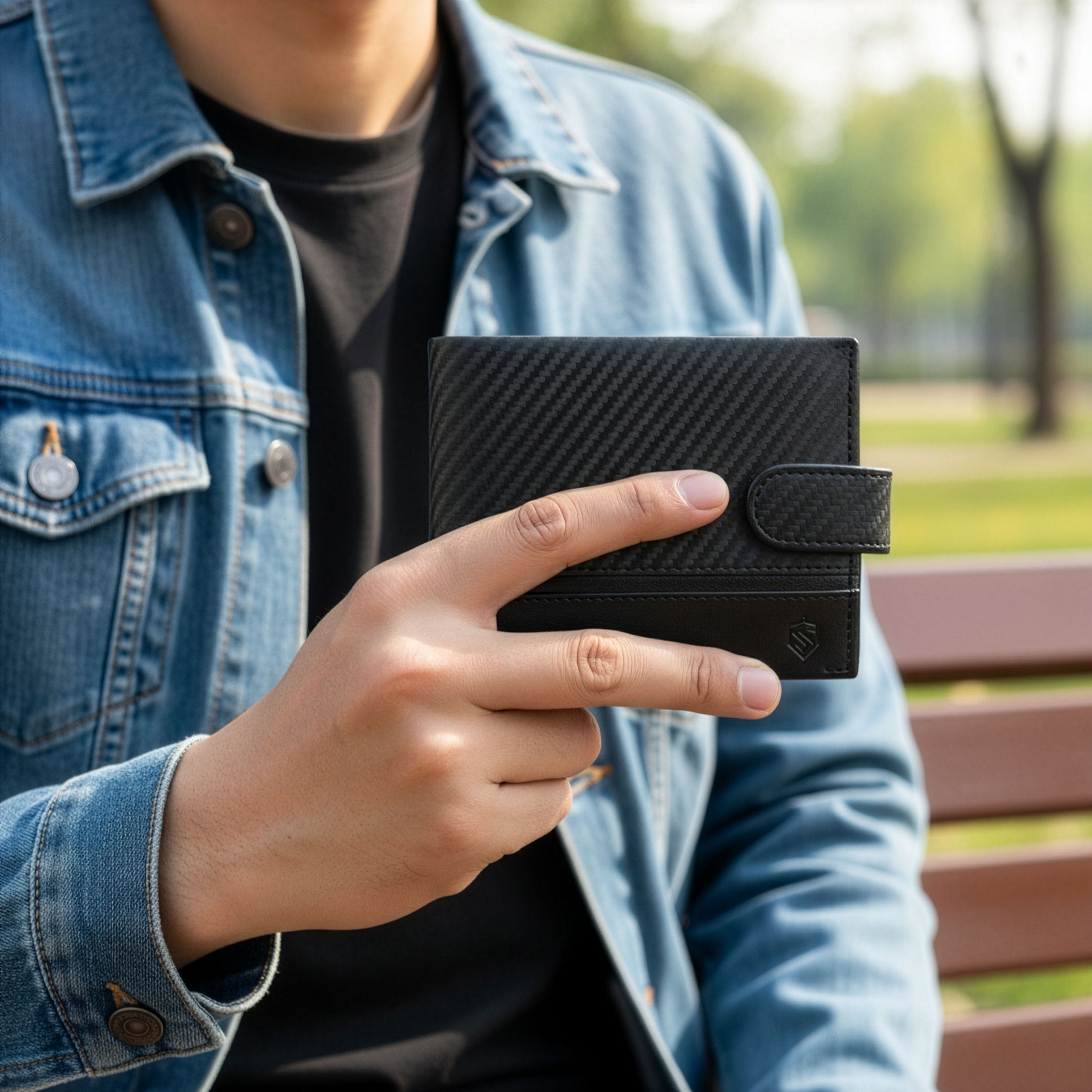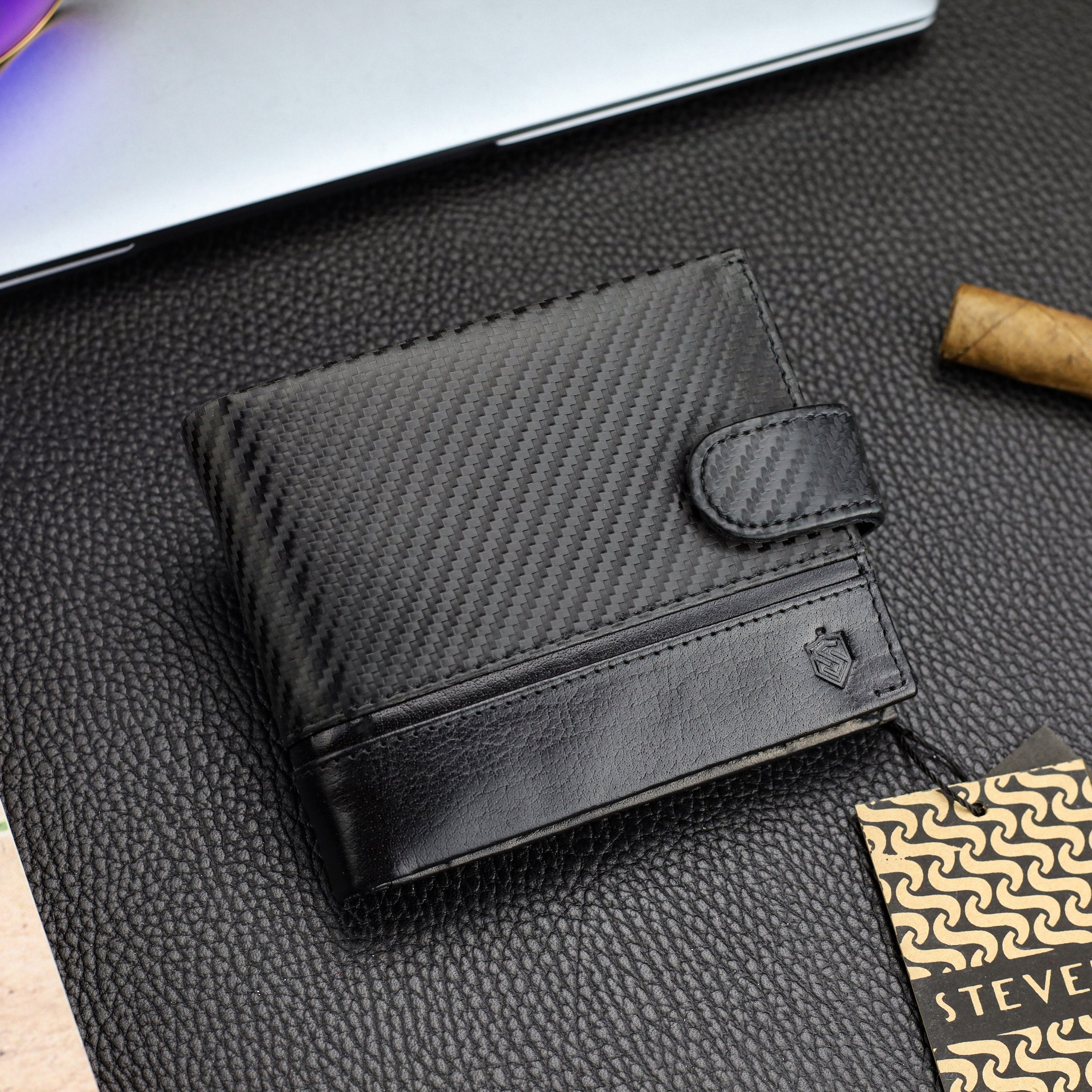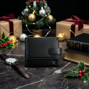 Horizontāls vīriešu maks, izgatavots no augstas kvalitātes dabīgās teļa ādas ar speciālu karbona tekstūras pārklājumu. Izmēri: 12,5 × 10,5 × 2,5 cm. Izturīgs, elegants un aprīkots ar RFID aizsardzību.