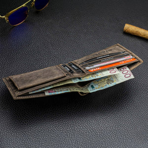 Horizontāls vīriešu maks, izgatavots no augstas kvalitātes dabīgas teļa ādas brūnā (nubuka tipa) tonī. Kompakts, plāns un ērts ikdienas lietošanai. Izmēri: 11,5 × 9 × 2,5 cm.