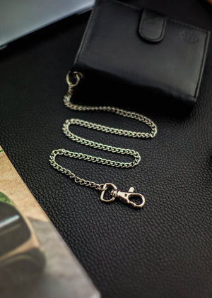 Šis elegantais vīriešu maks ir izgatavots no augstas kvalitātes īstas kazas ādas, nodrošinot izturību un stilu. Komplektā iekļautā 50 cm garā metāla ķēdīte ar omāra aizdari nodrošina papildu drošību un unikālu dizainu.