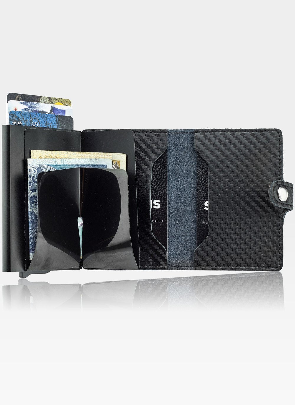 Ārējais apvalks ir pārklāts ar ādu, savukārt iekšpuse ir izgatavota no alumīnija ar karšu izņemšanas mehānismu. RFID bloķējošais pārklājums nodrošina drošību. Kartes tiek izņemtas, izmantojot pogu maciņa apakšā, un tās ir izvietotas vēdekļveida formā. Iekšpusē ir trīs kabatas, kas piemērotas kartēm vai dokumentiem, kā arī vieta banknotēm.