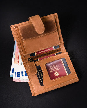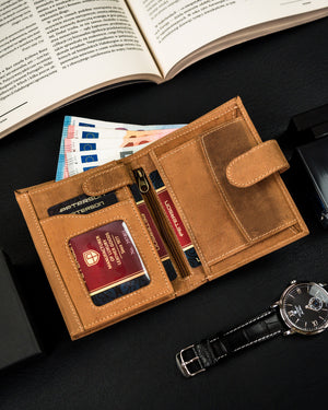 Šis elegantais un funkcionālais maks ir lieliska izvēle vīriešiem, kuri novērtē kvalitāti un stilu. Izgatavots no īstas ādas, tas nodrošina izturību un uzticamību. Gaiši brūnā krāsa piešķir klasisku un izsmalcinātu izskatu. Makam ir RFID aizsardzība, kas palīdz aizsargāt jūsu kartes no nevēlamas skenēšanas. Ar 6-10 karšu nodalījumiem tas ir praktisks un ietilpīgs. Tā izmēri - 12,5 cm x 10 cm x 2,5 cm - ļauj to ērti uzglabāt kabatā vai somā.