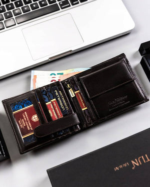 Šis īstas ādas vīriešu maks ir lieliska izvēle tiem, kas novērtē kvalitāti un funkcionalitāti. Tumši brūnā krāsa piešķir eleganci, un lielais izmērs nodrošina, ka jums būs pietiekami daudz vietas visām jūsu kartēm un skaidrai naudai. Pateicoties integrētajai RFID aizsardzībai, jūsu dati būs pasargāti no neatļautas skenēšanas. Makam ir 6-10 karšu nodalījumi, tāpēc varat ērti uzglabāt visas nepieciešamās kartes. Tā kompaktie izmēri ļauj to viegli ievietot kabatā vai somā.