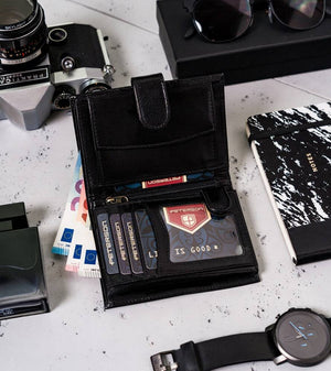 Šis elegantais Peterson zīmola maks ir izgatavots no augstas kvalitātes īstas ādas, kas nodrošina izturību un stilu. Melnais dizains nodrošina klasisku un daudzpusīgu izskatu, kas piemērots jebkuram gadījumam.